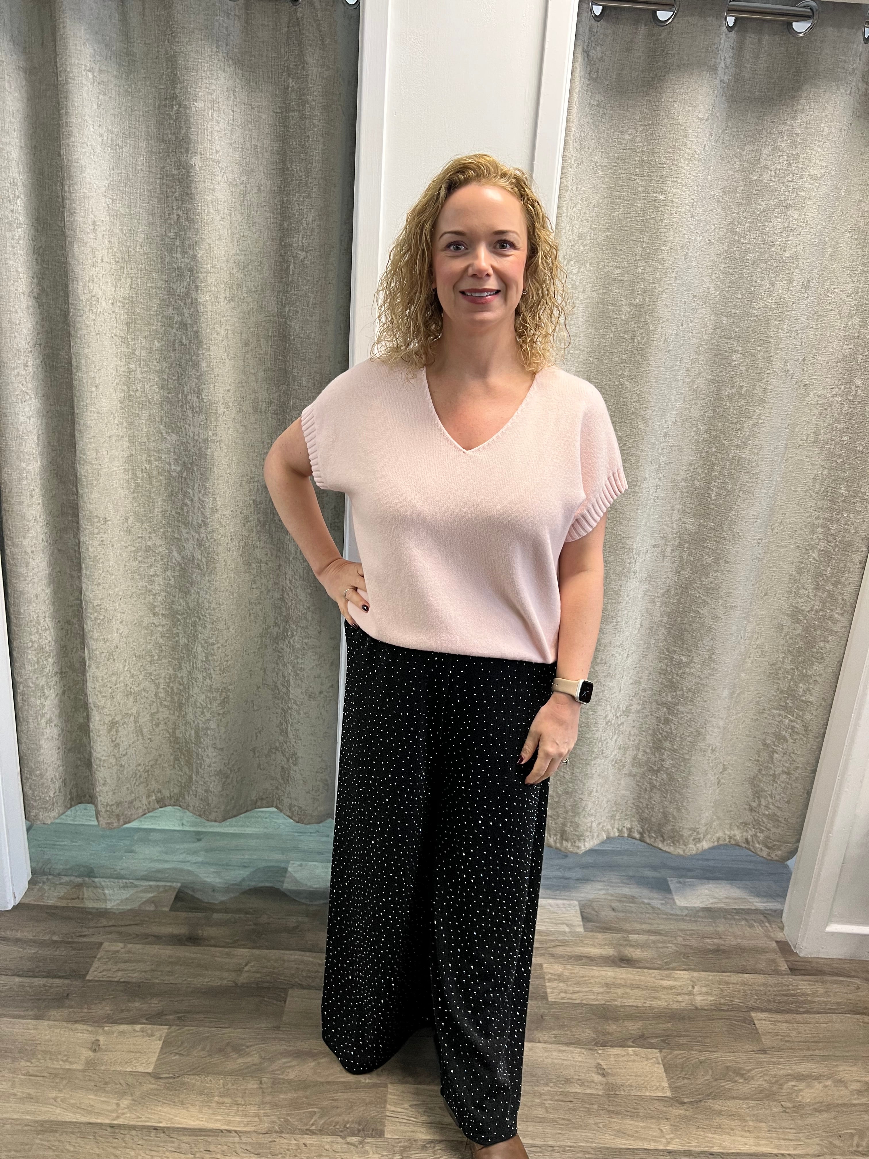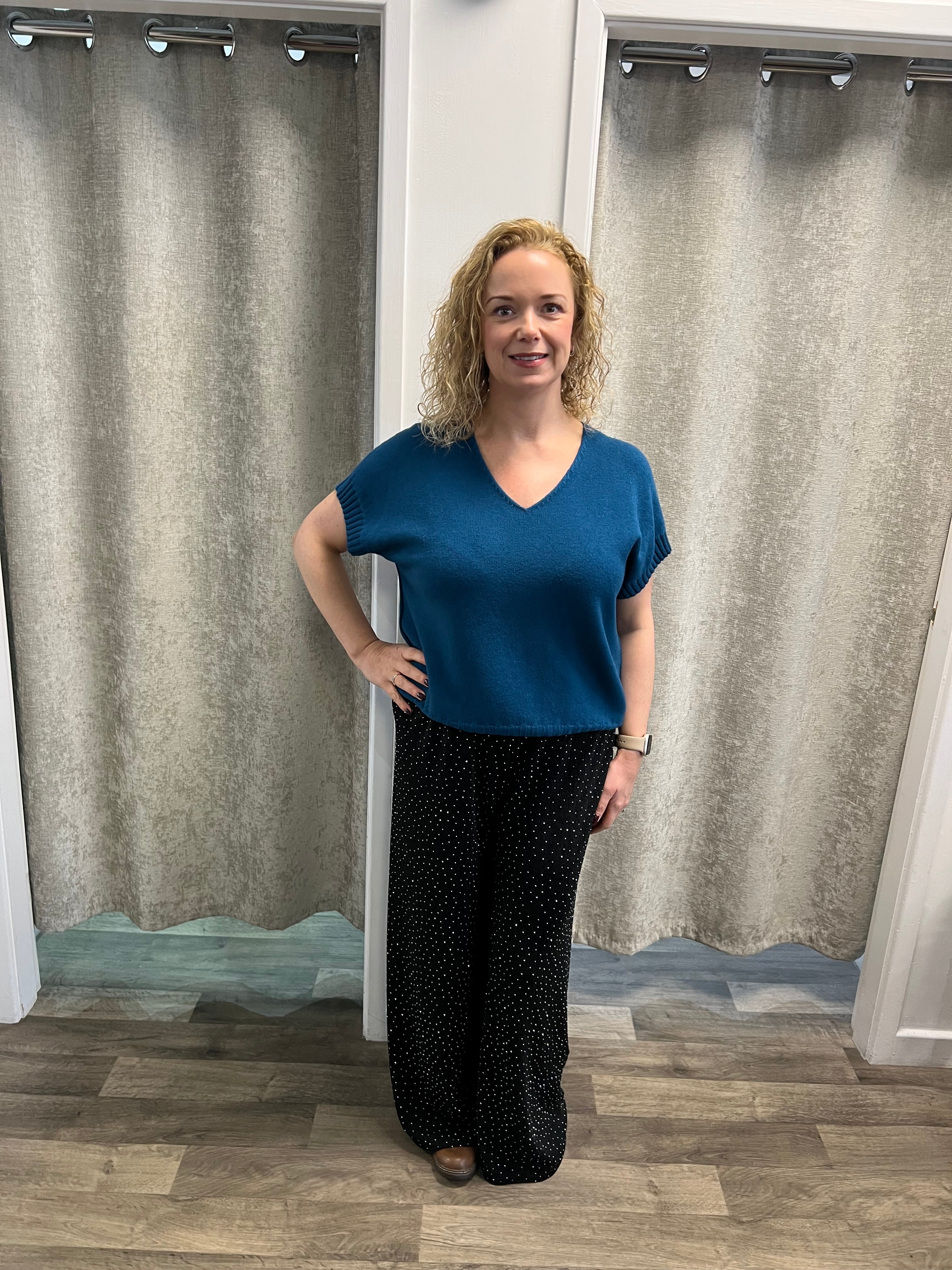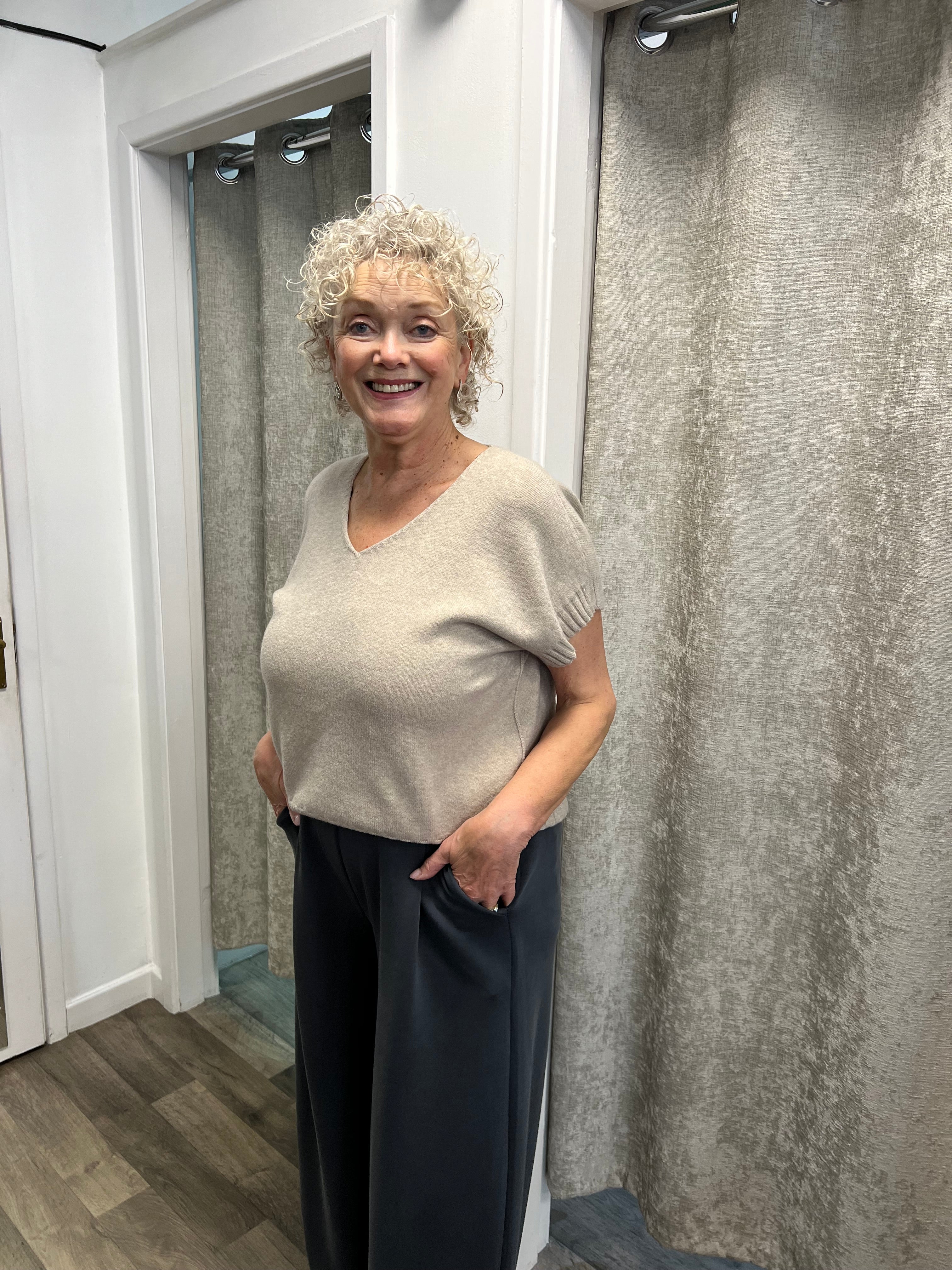 Shorter length knit with rib detail at the arm and hem, with v neck and stitch detail at the neck.