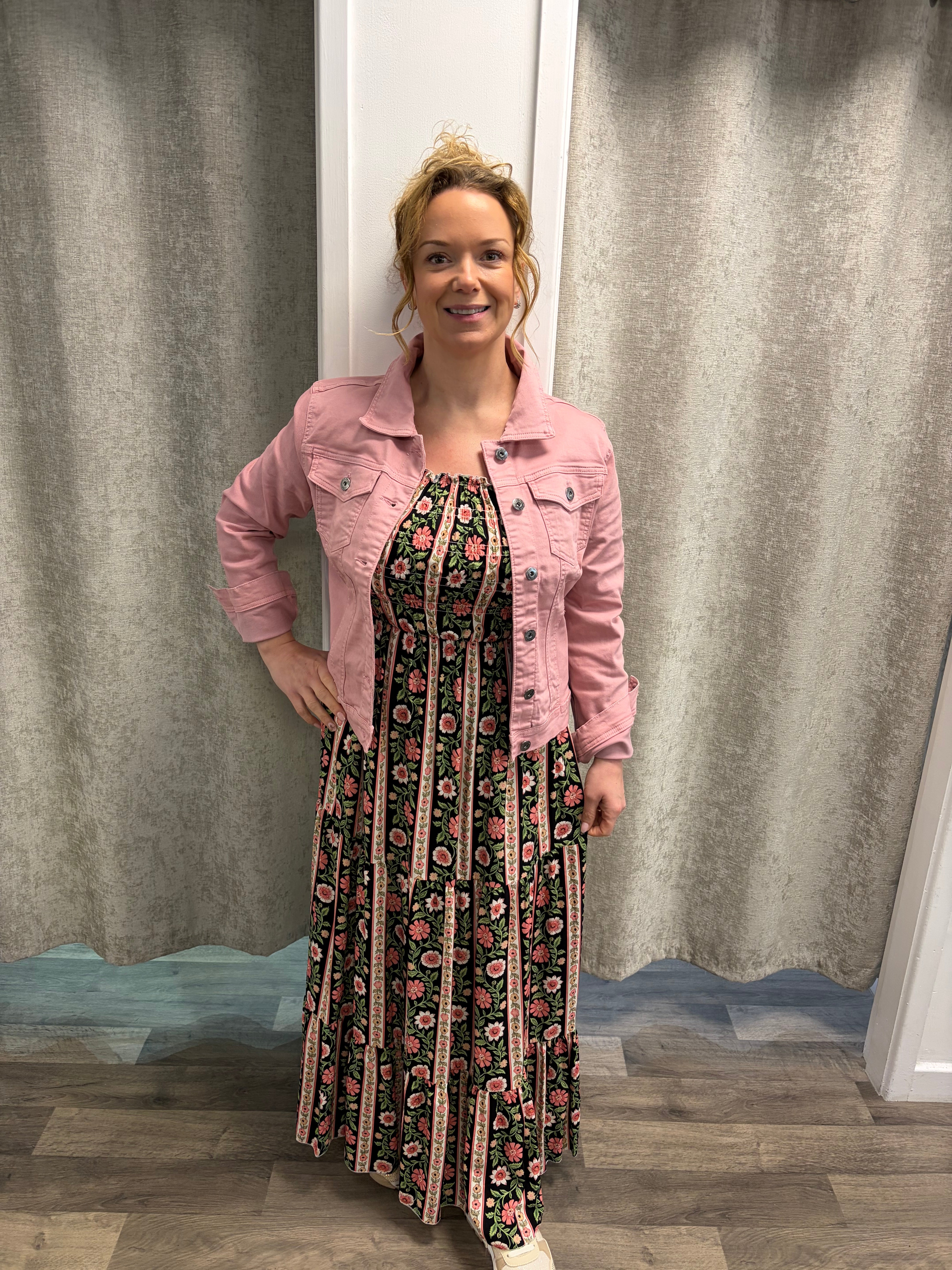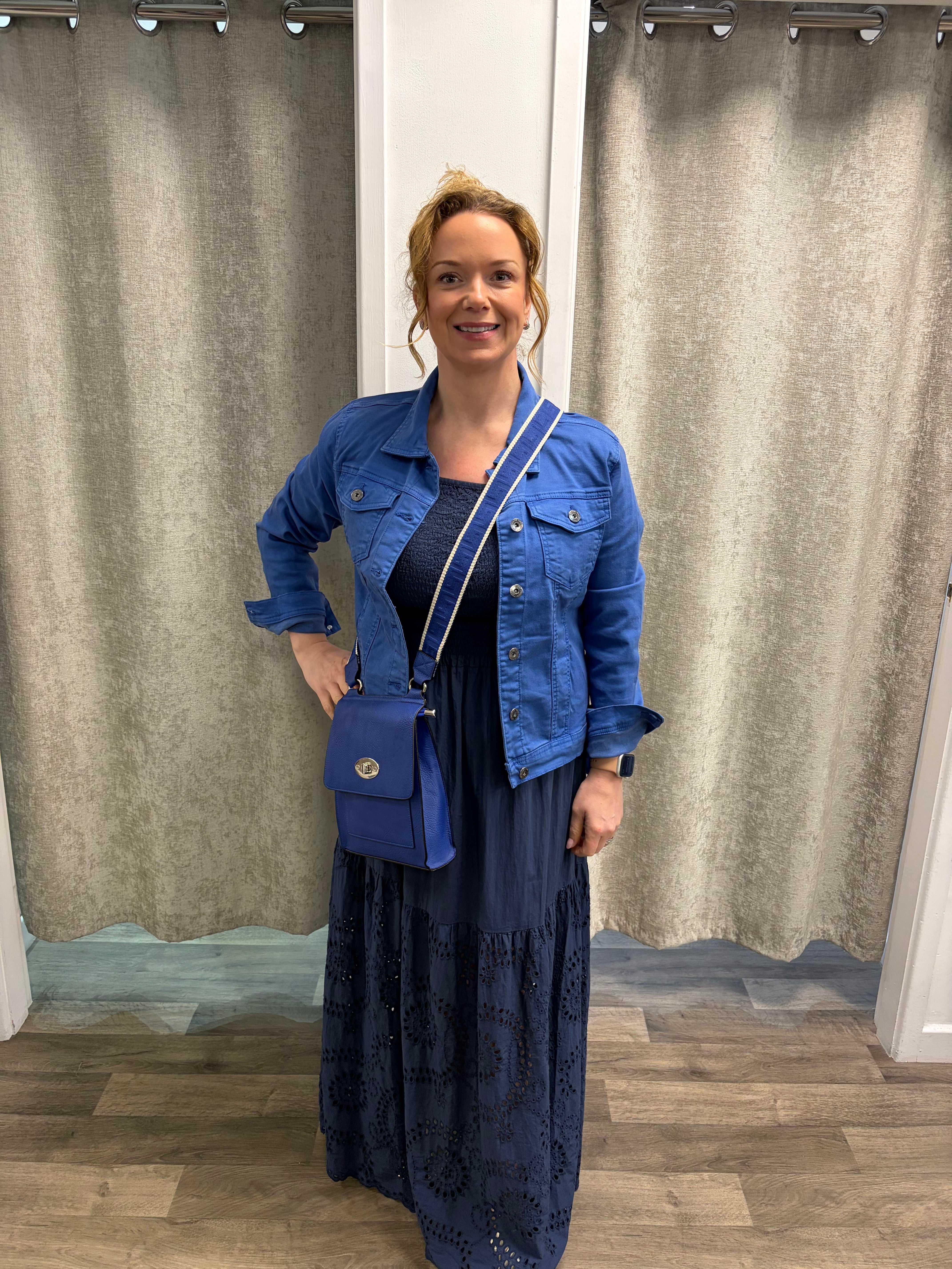Lots of spring colours in our denim jacket, true to size and lovely stretch fabric.