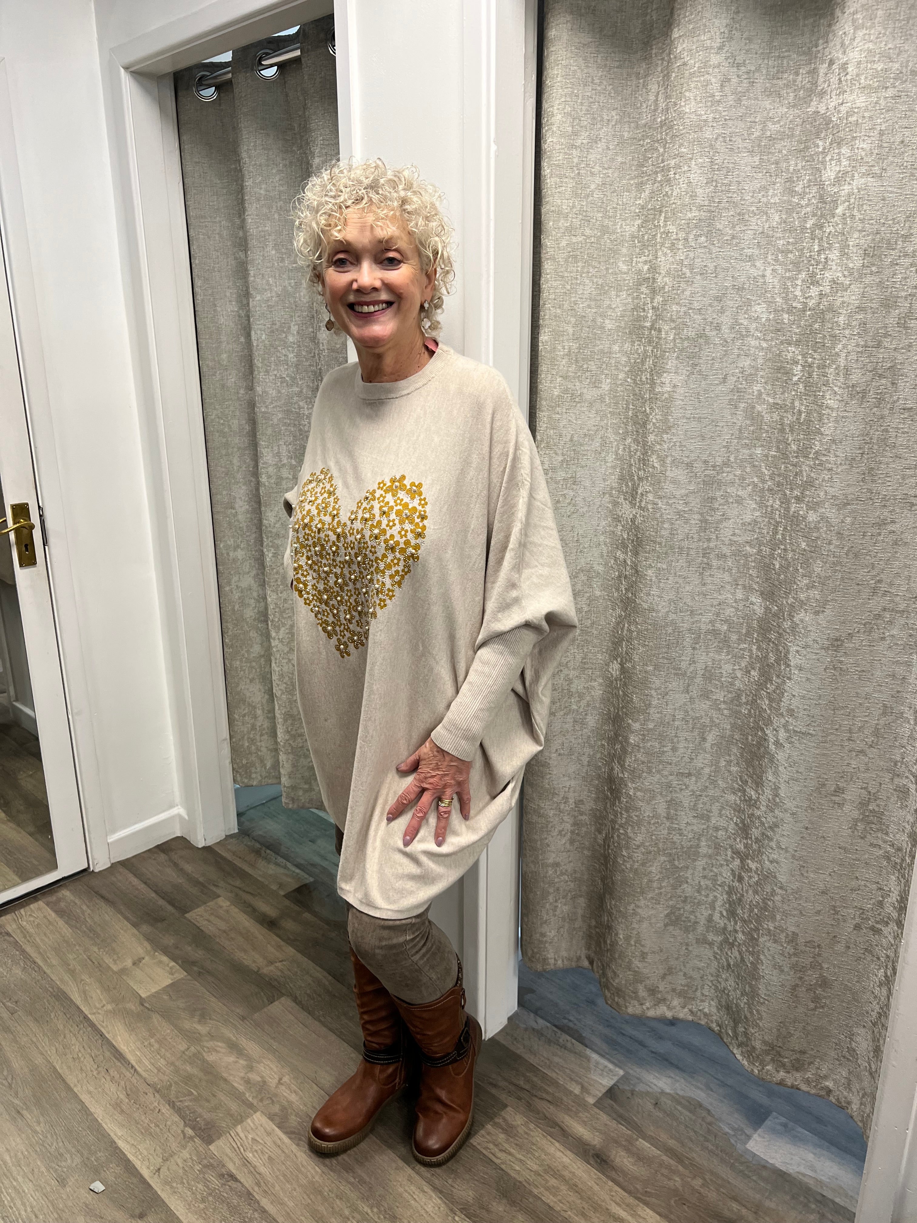 Gorgeous oversized knit with pearl sparkly and flower print in a large printed heart.