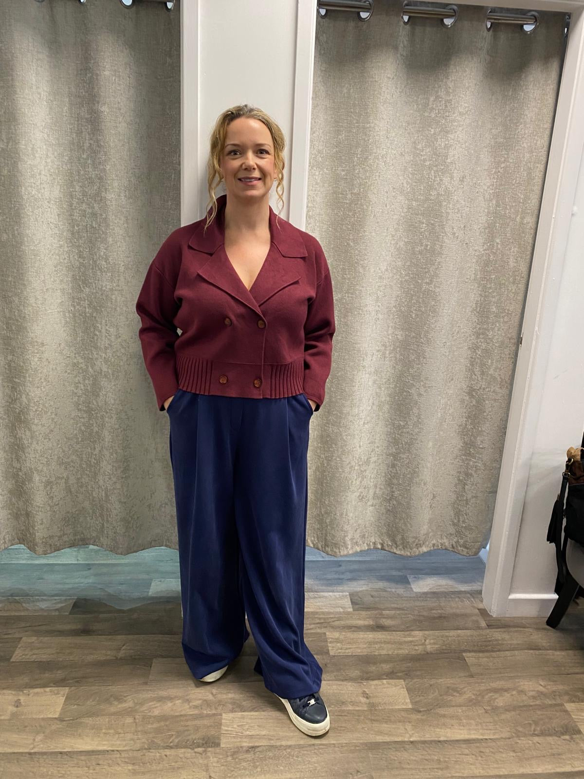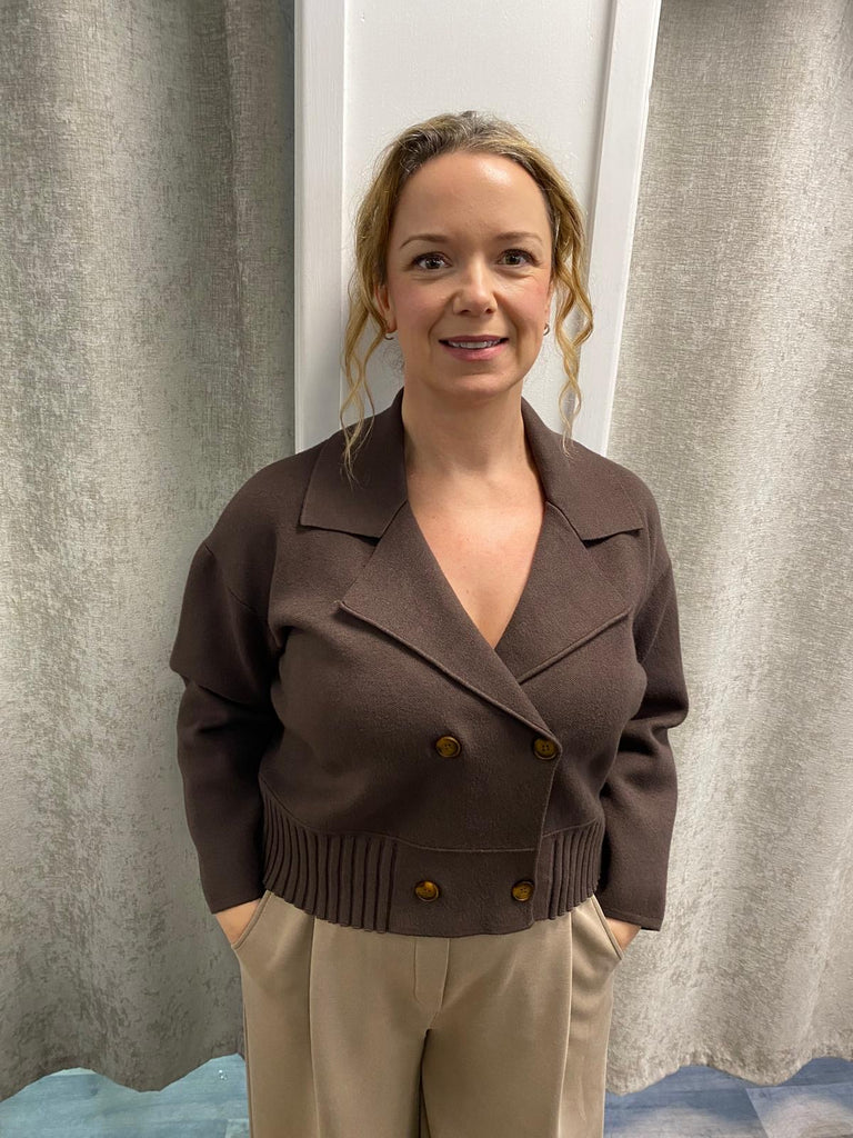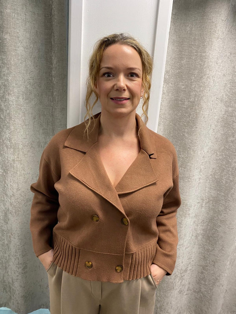 Gorgeous double breasted knit jacket with rib detail.