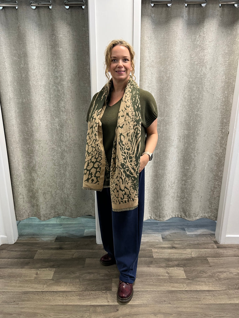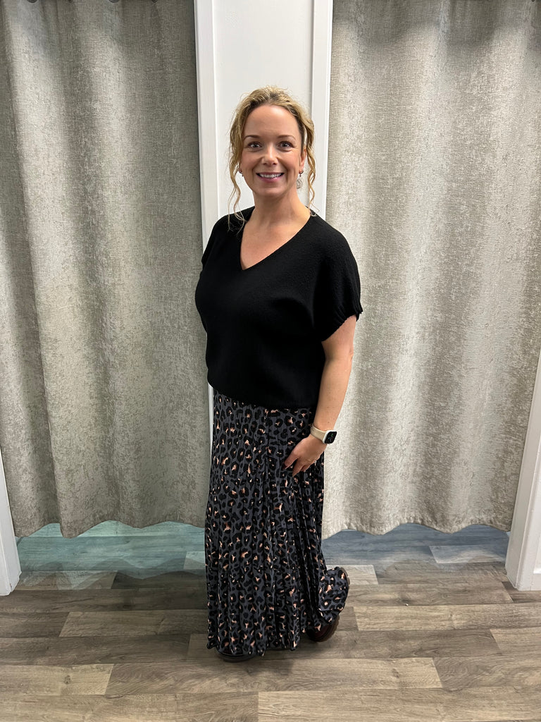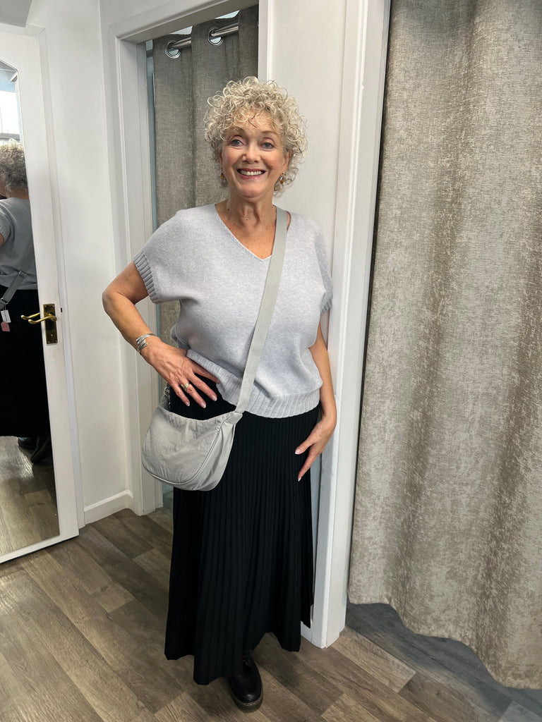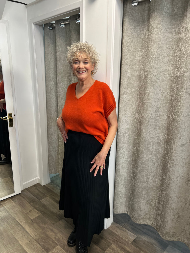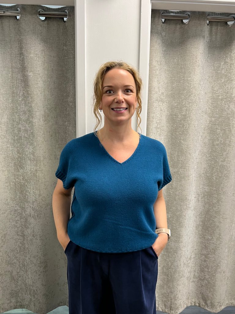 Shorter length knit with rib detail at the arm and hem, with v neck and stitch detail at the neck.