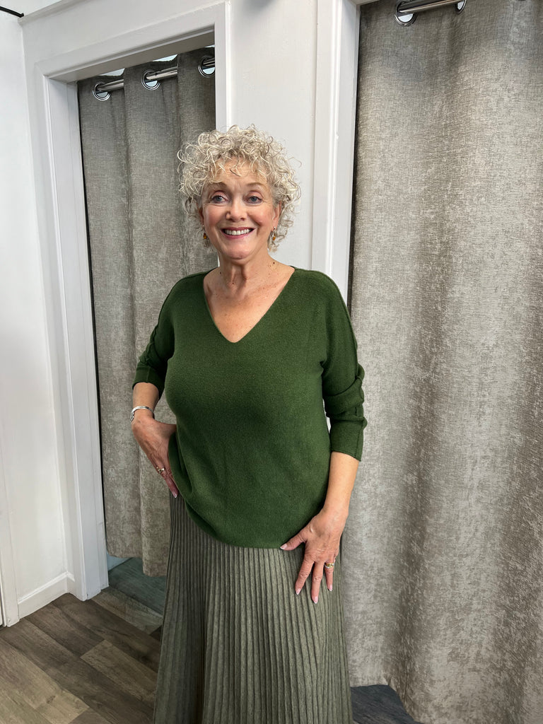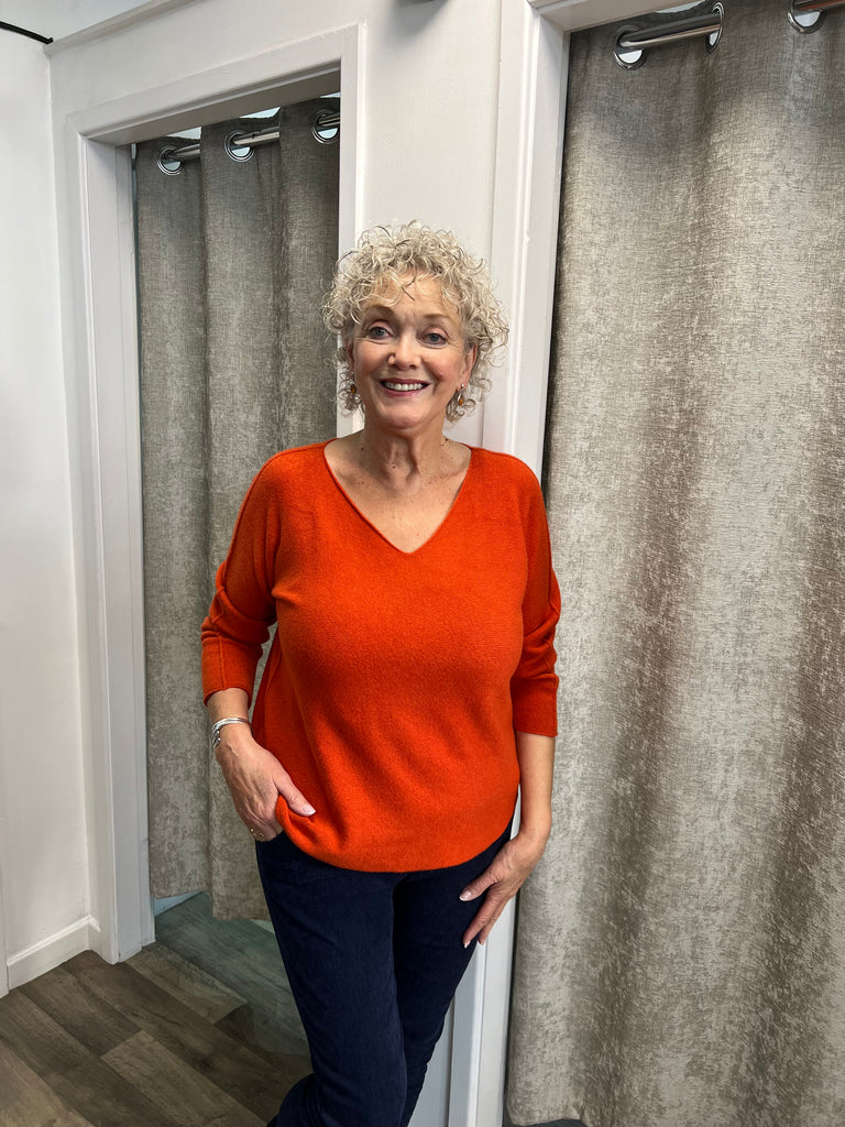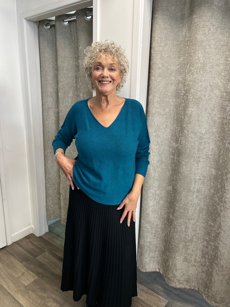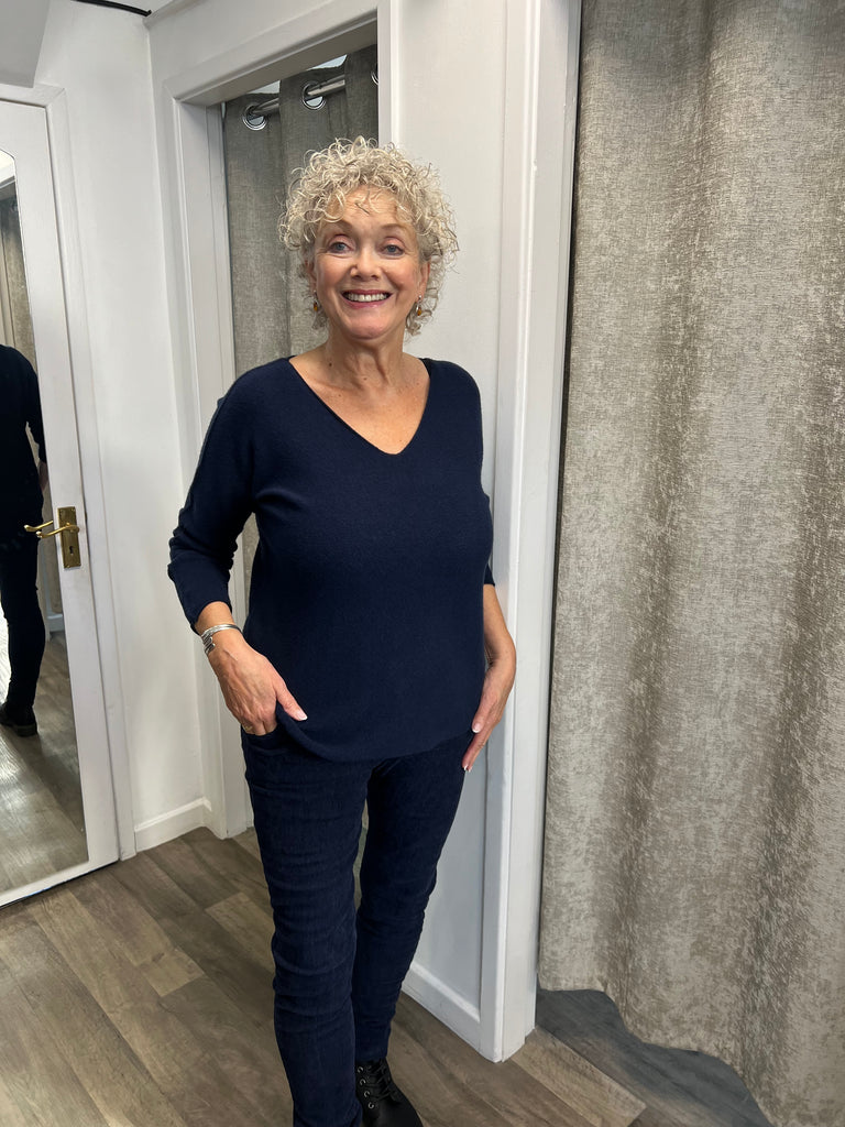 Our best selling knit now with a v neck, super soft and cosy looks great with a scarf too.
