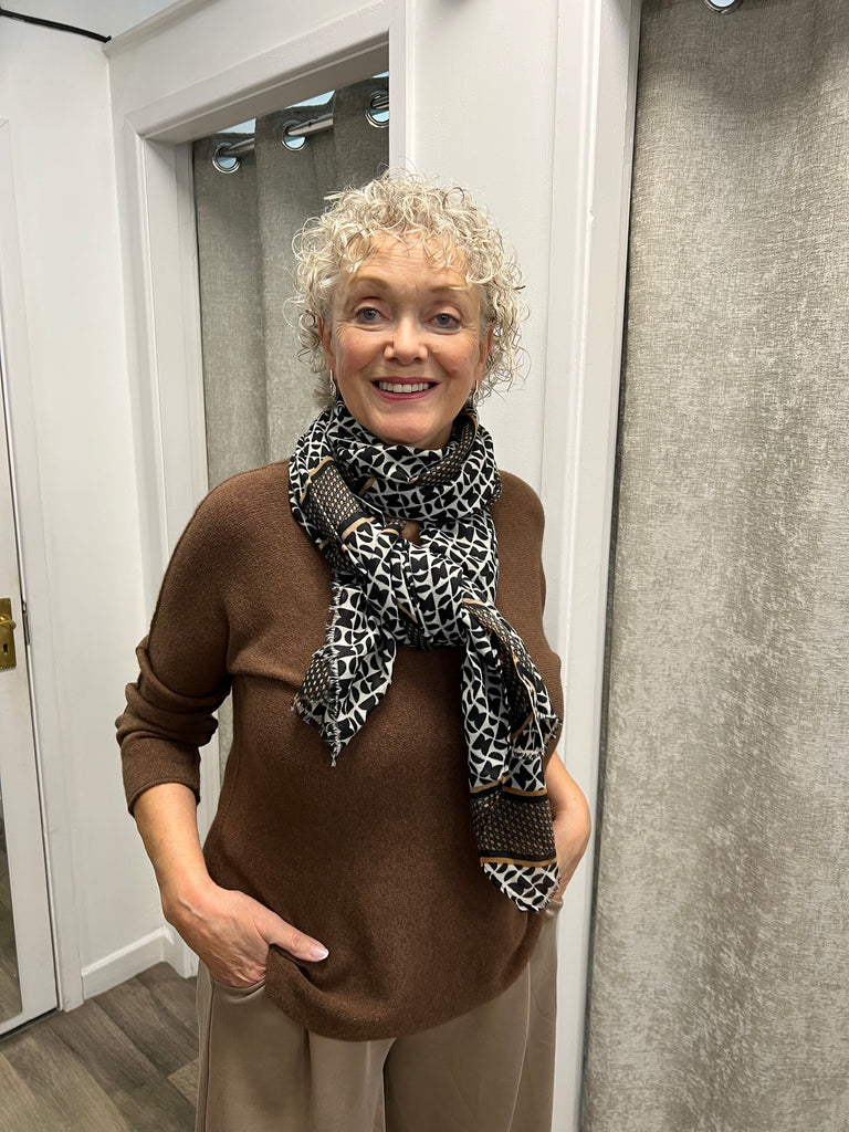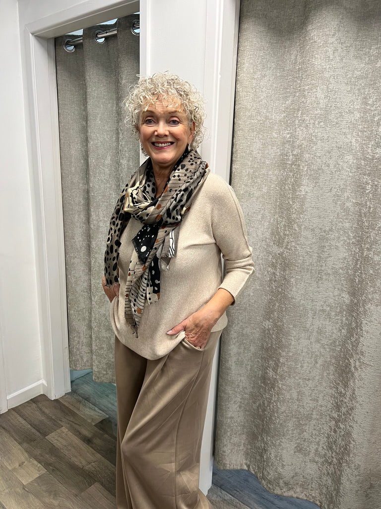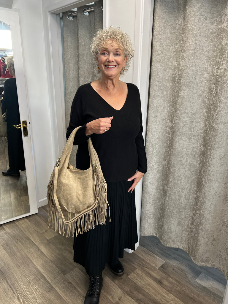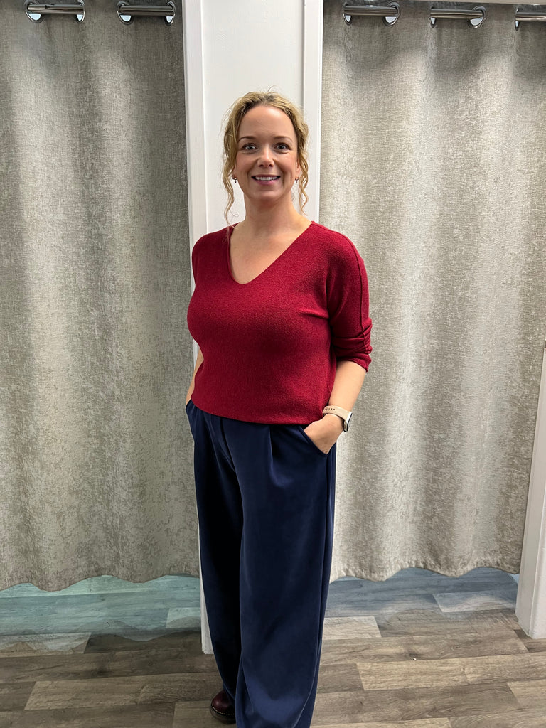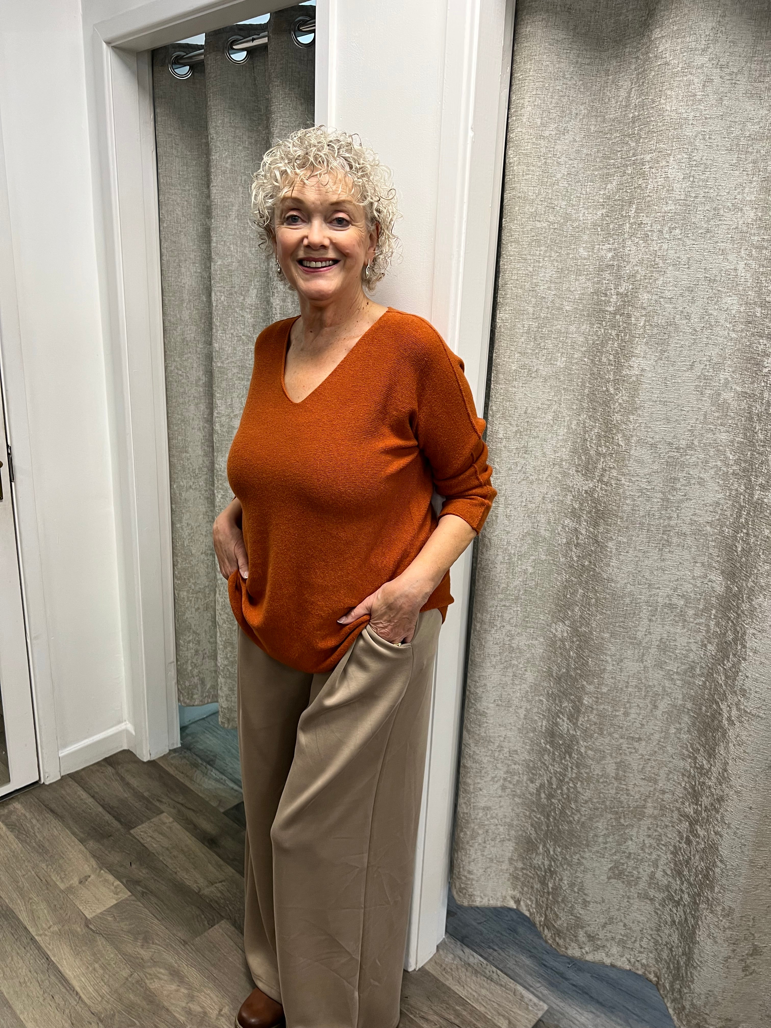 Our best selling knit now with a v neck, super soft and cosy looks great with a scarf too.