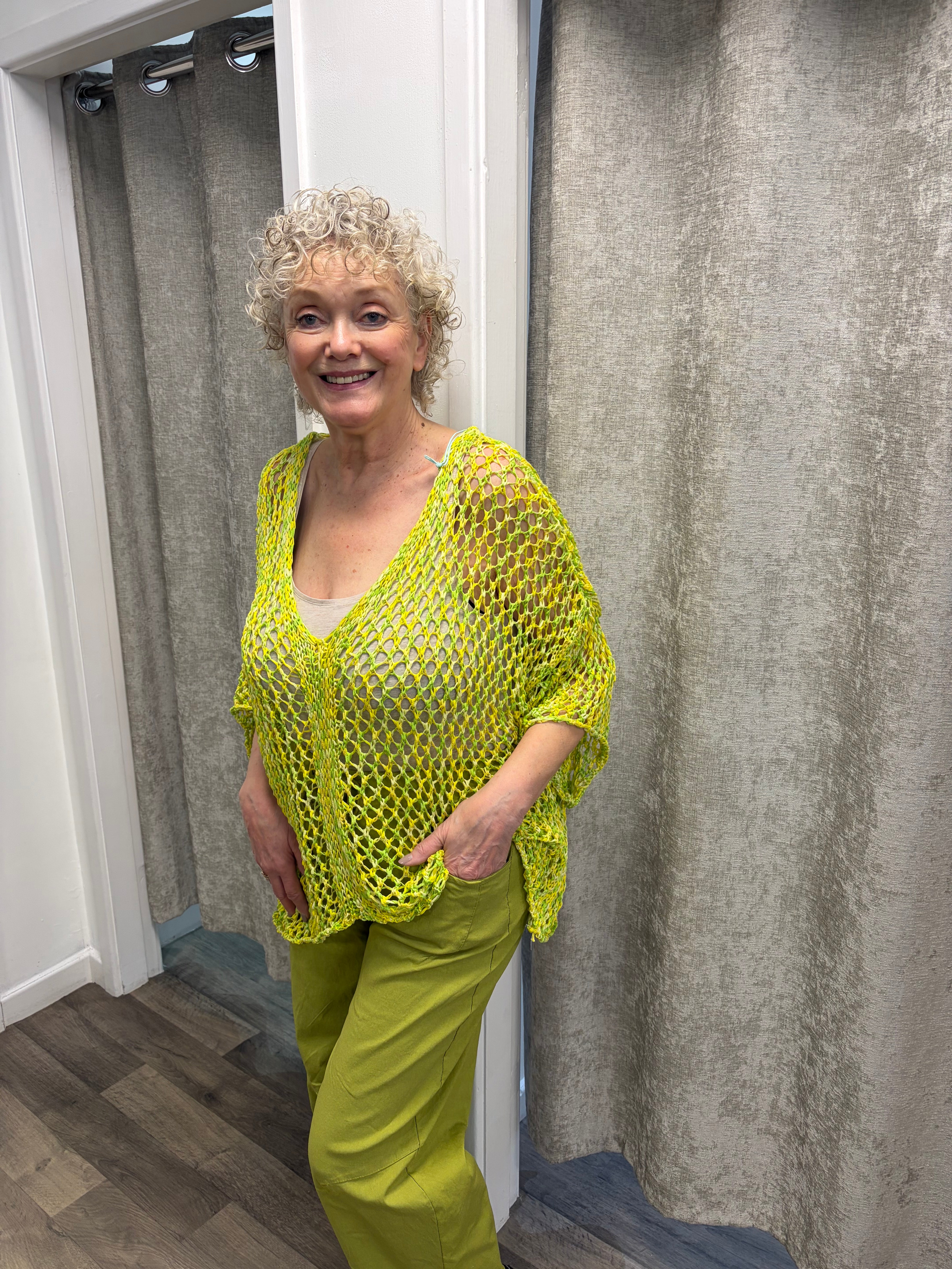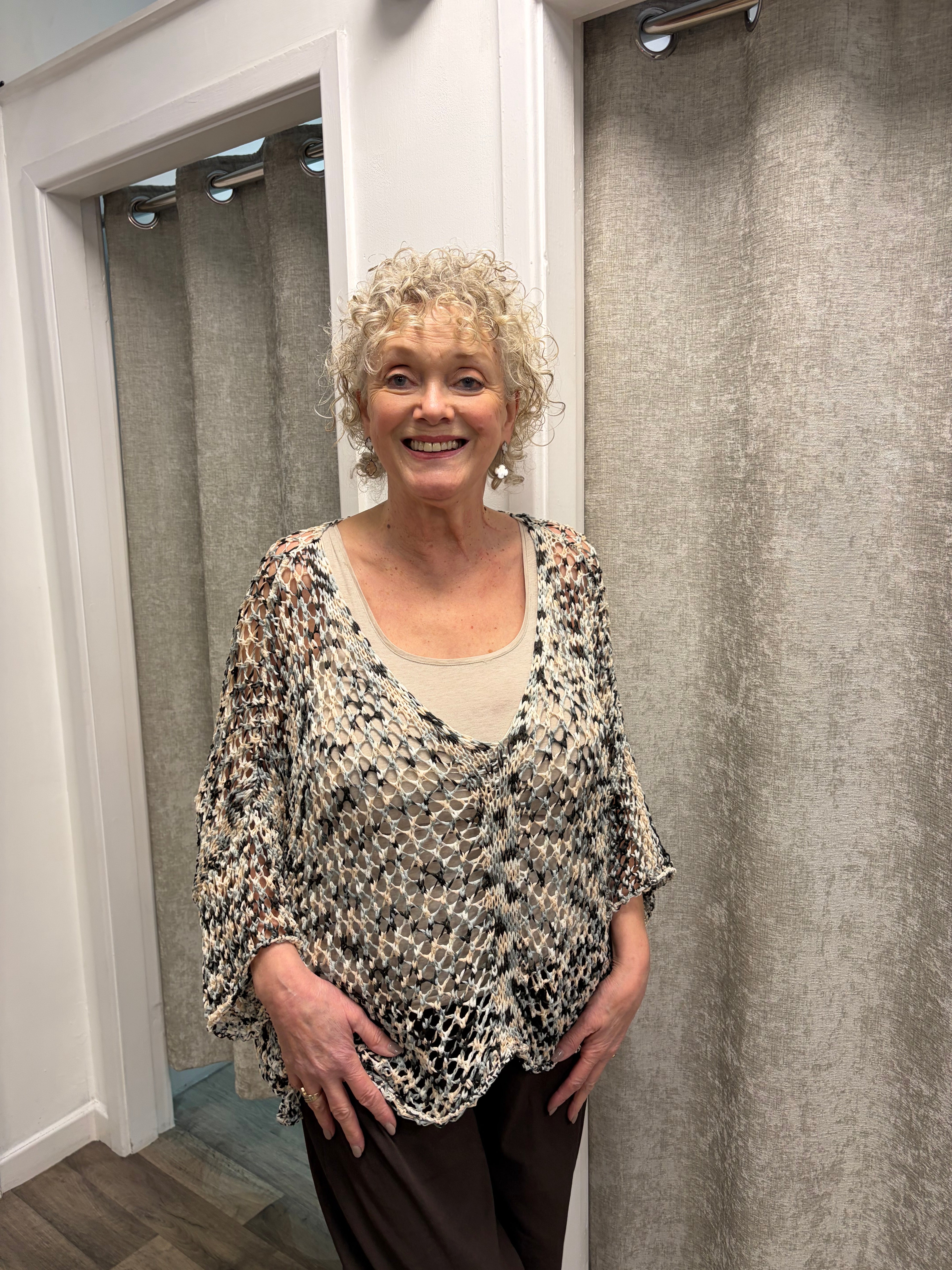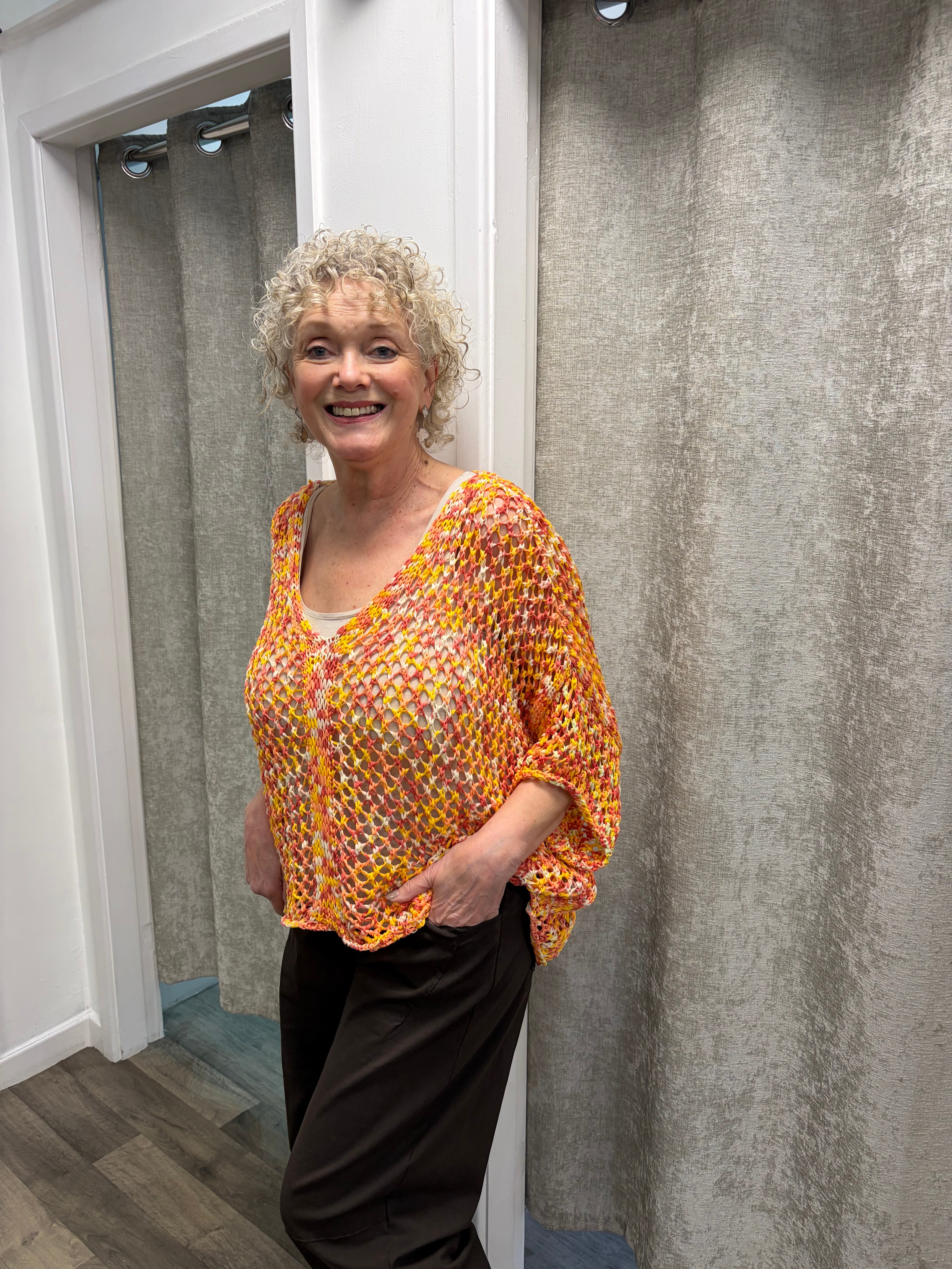 Multi coloured oversized top with v neckline and short sleeves, will look great over a dress or over one of our cashmere layering tops.