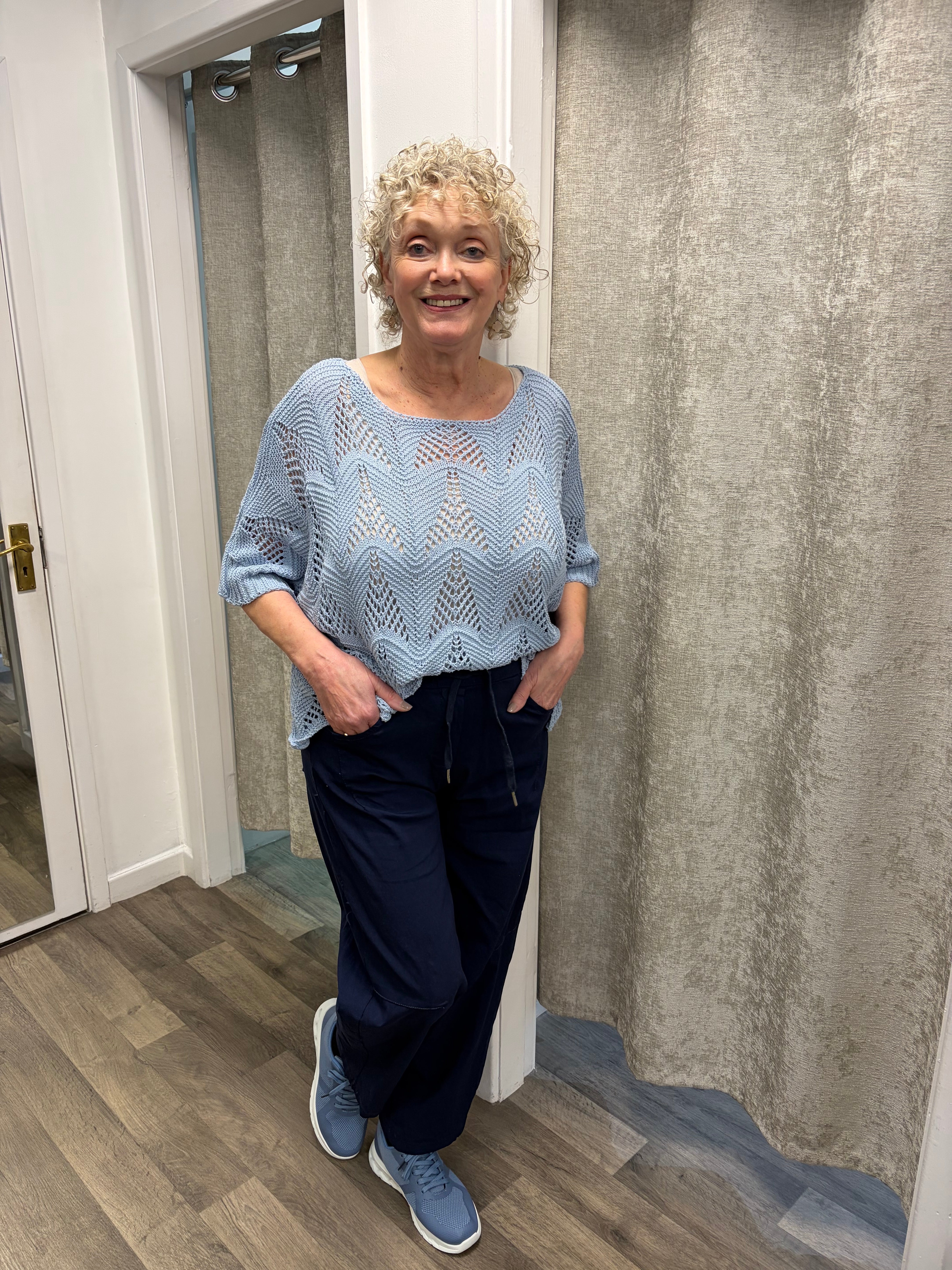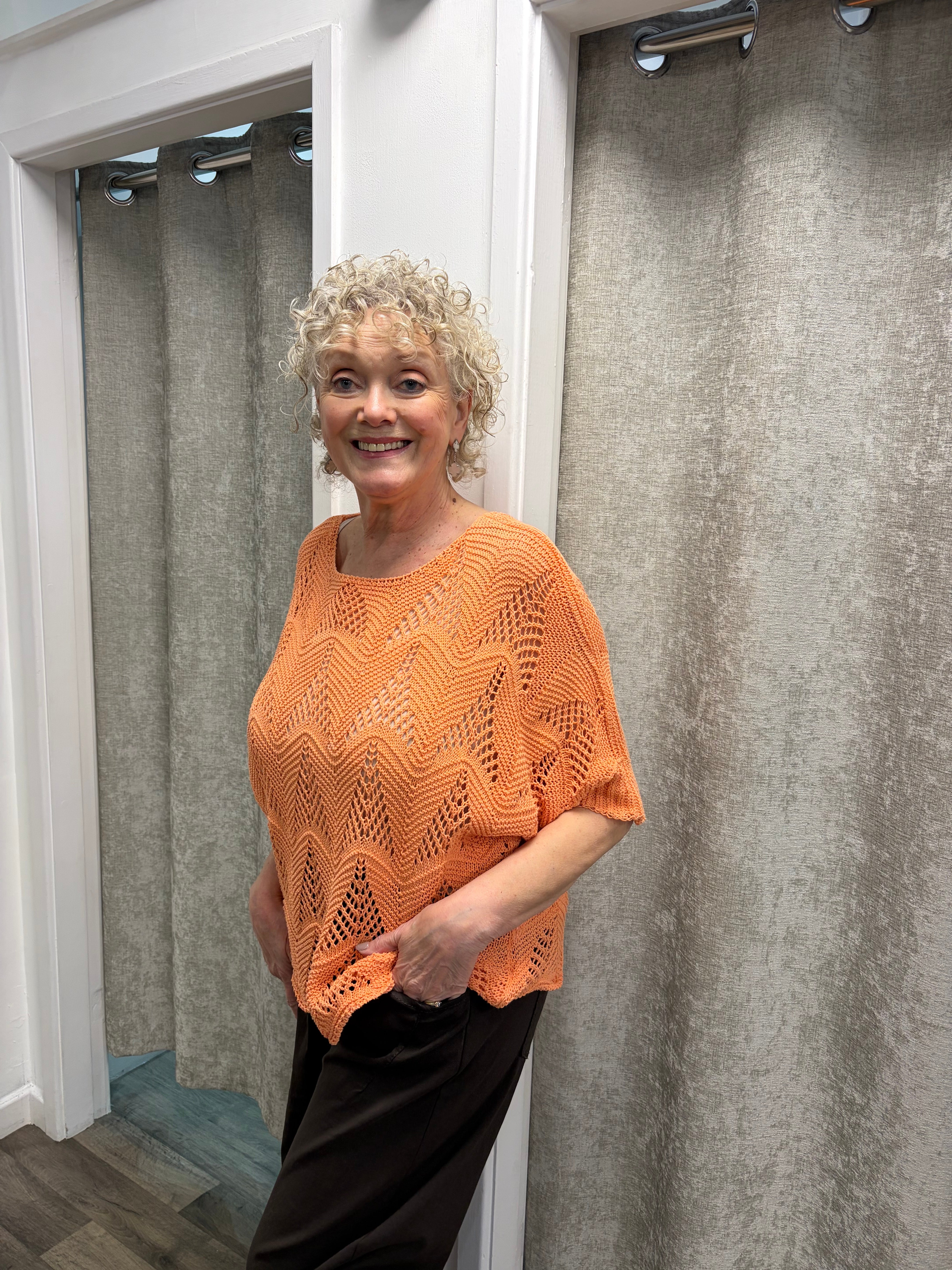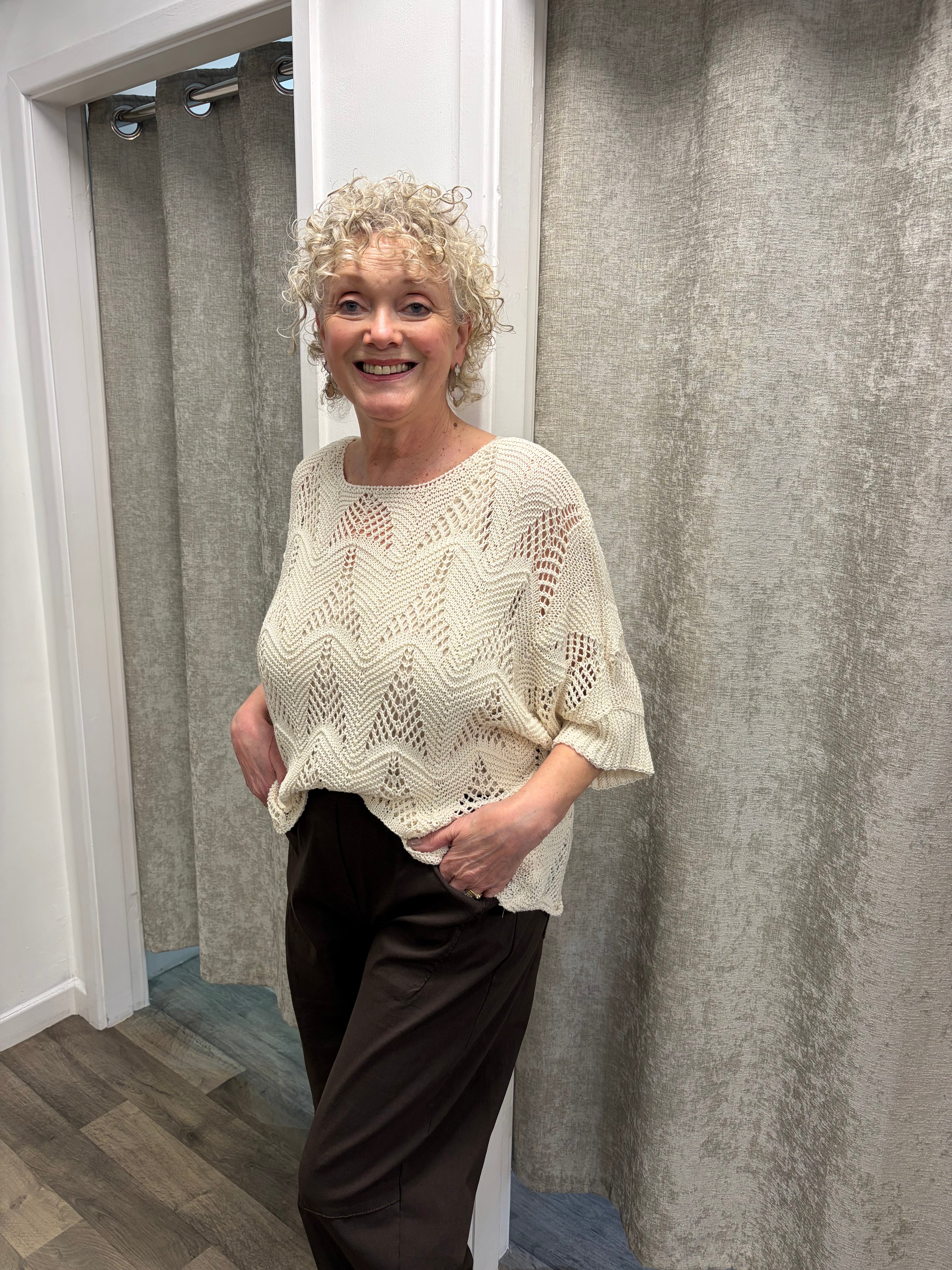 Lovely crochet top with wave design, looks great with our cashmere layering tops under or over a dress.