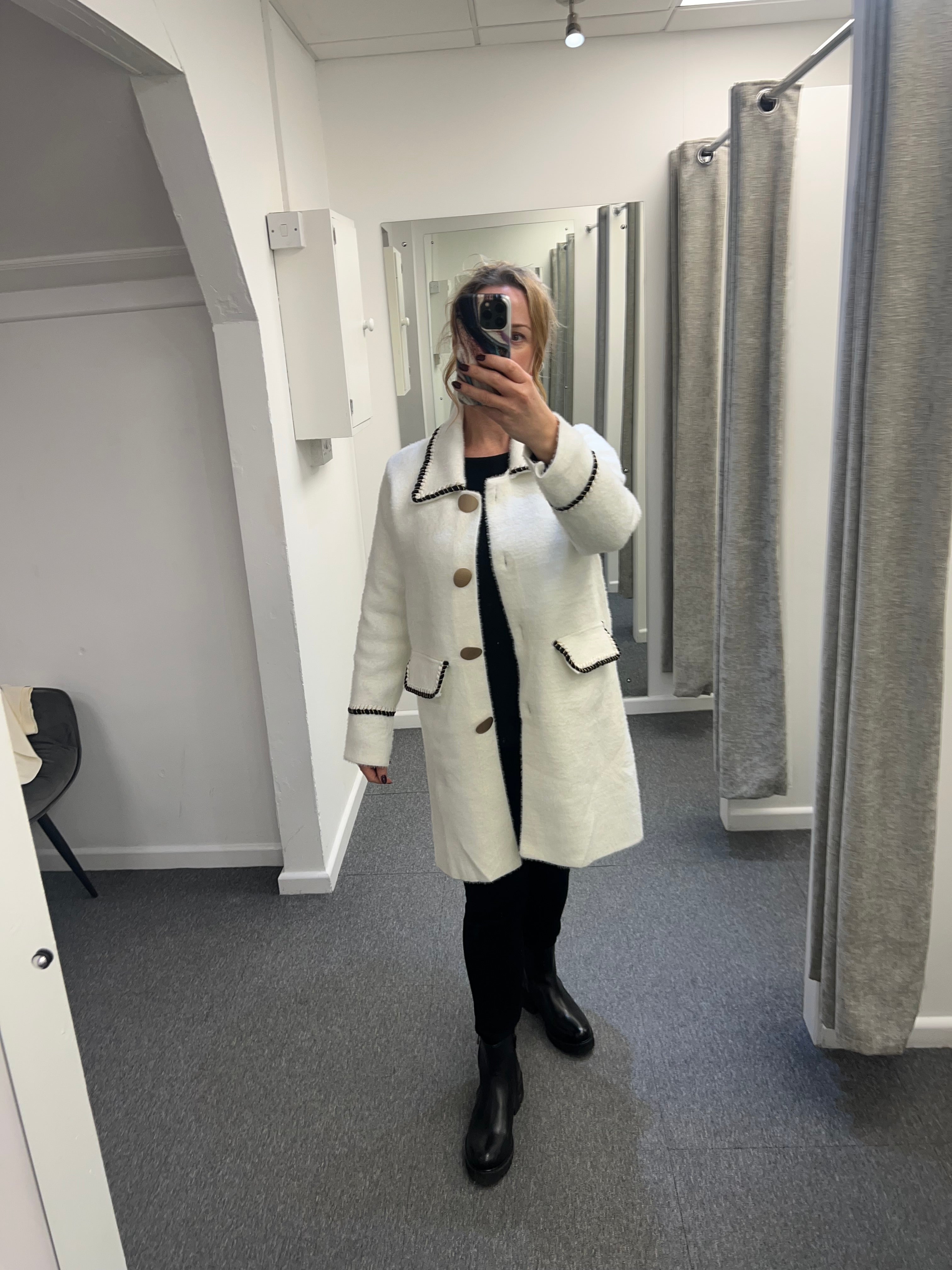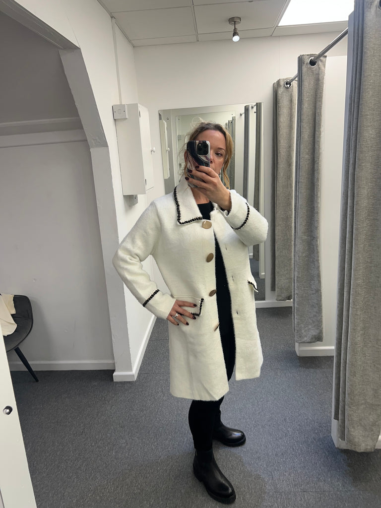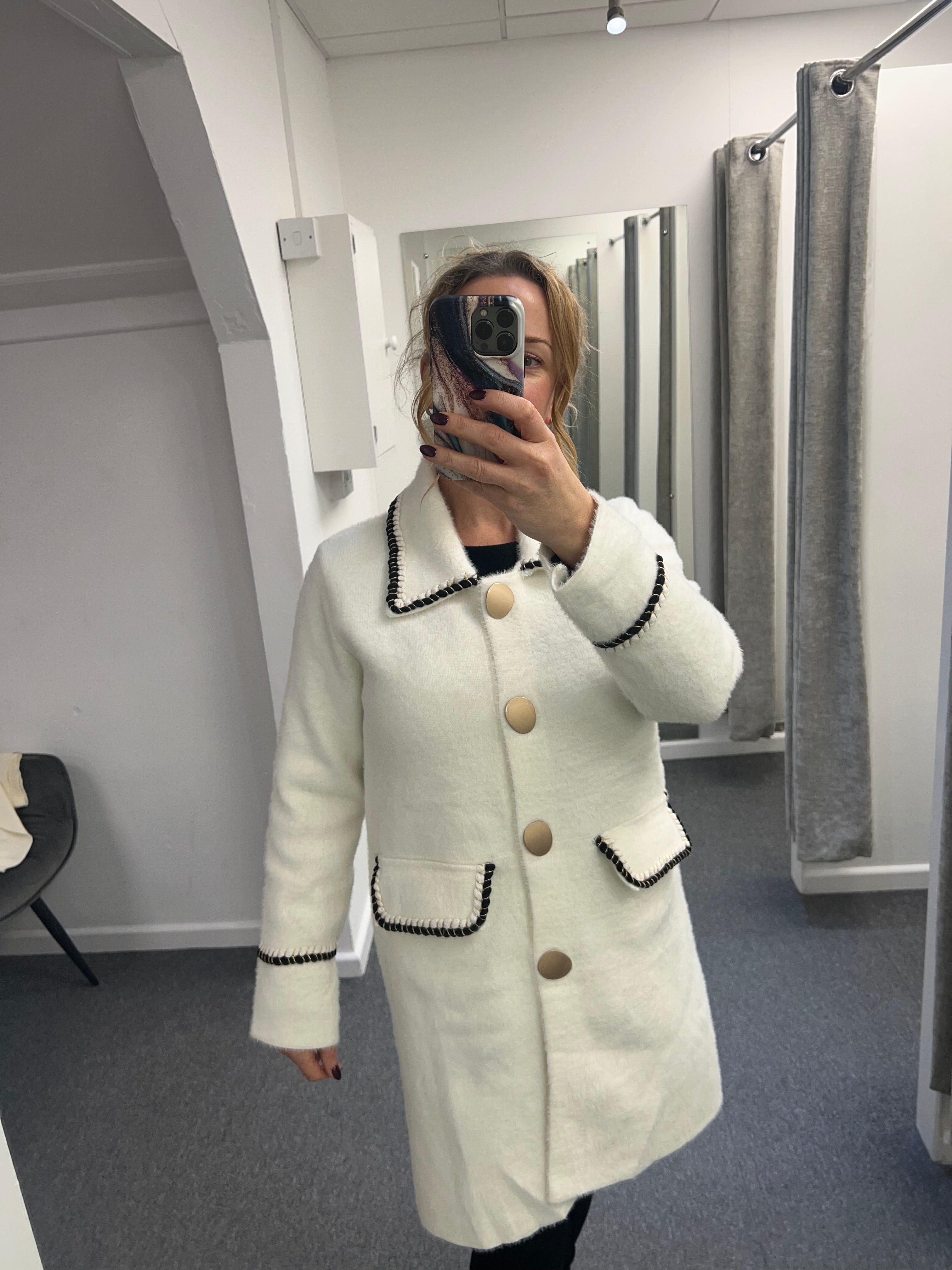 Stunning coat cardigan with large gold buttons and black with gold trim.