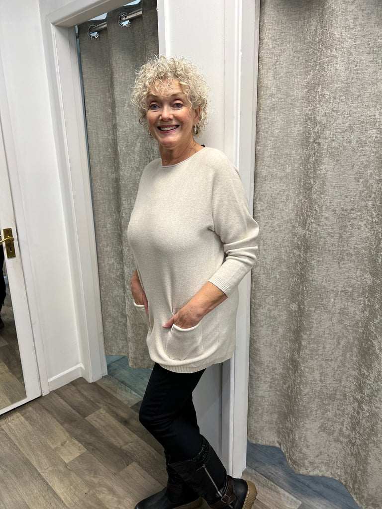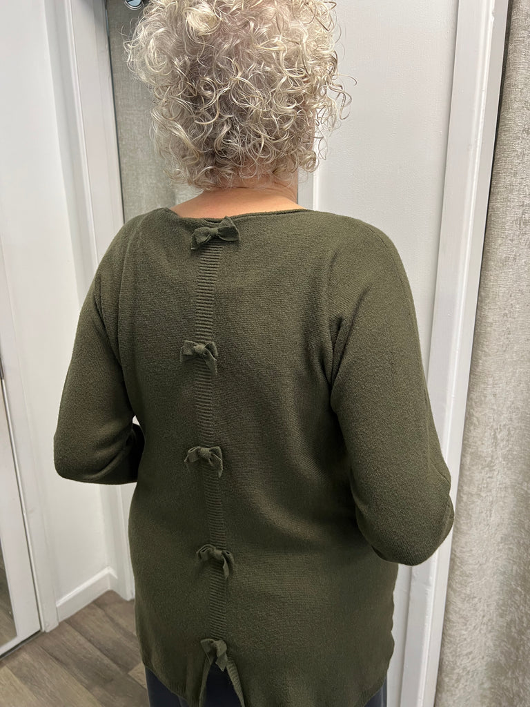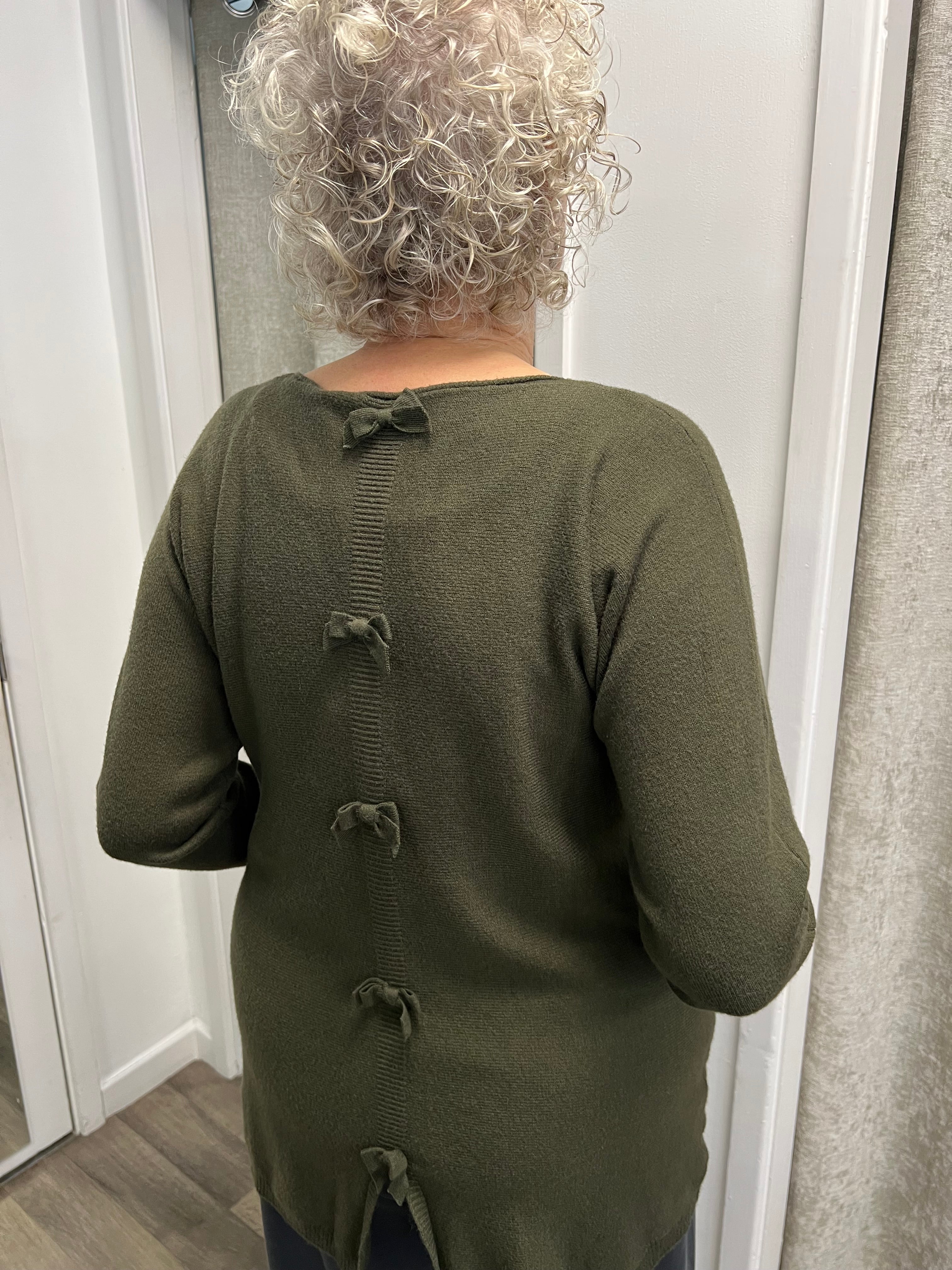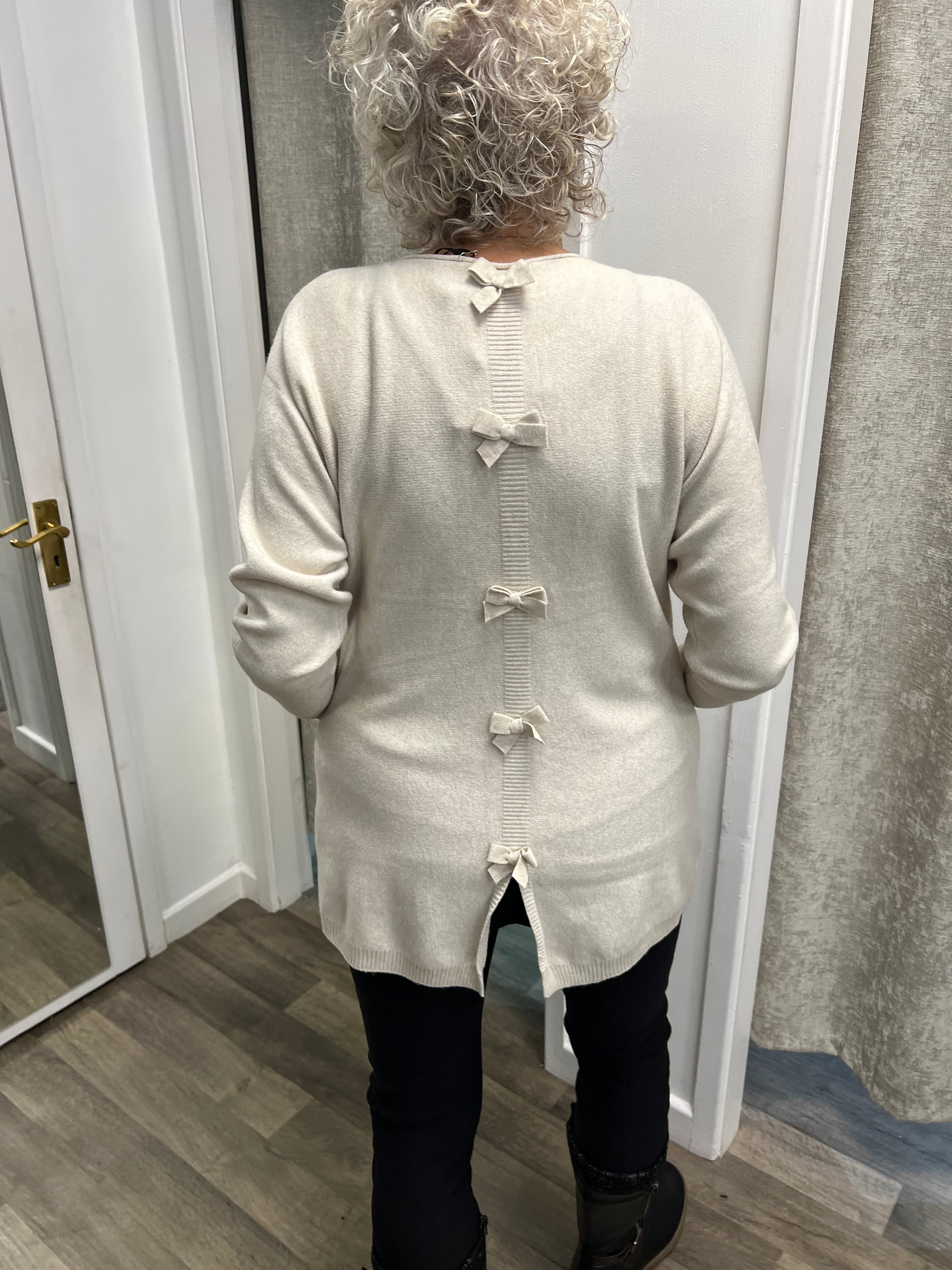 Lovely longer length knit with 2 pockets and bows going down the back.