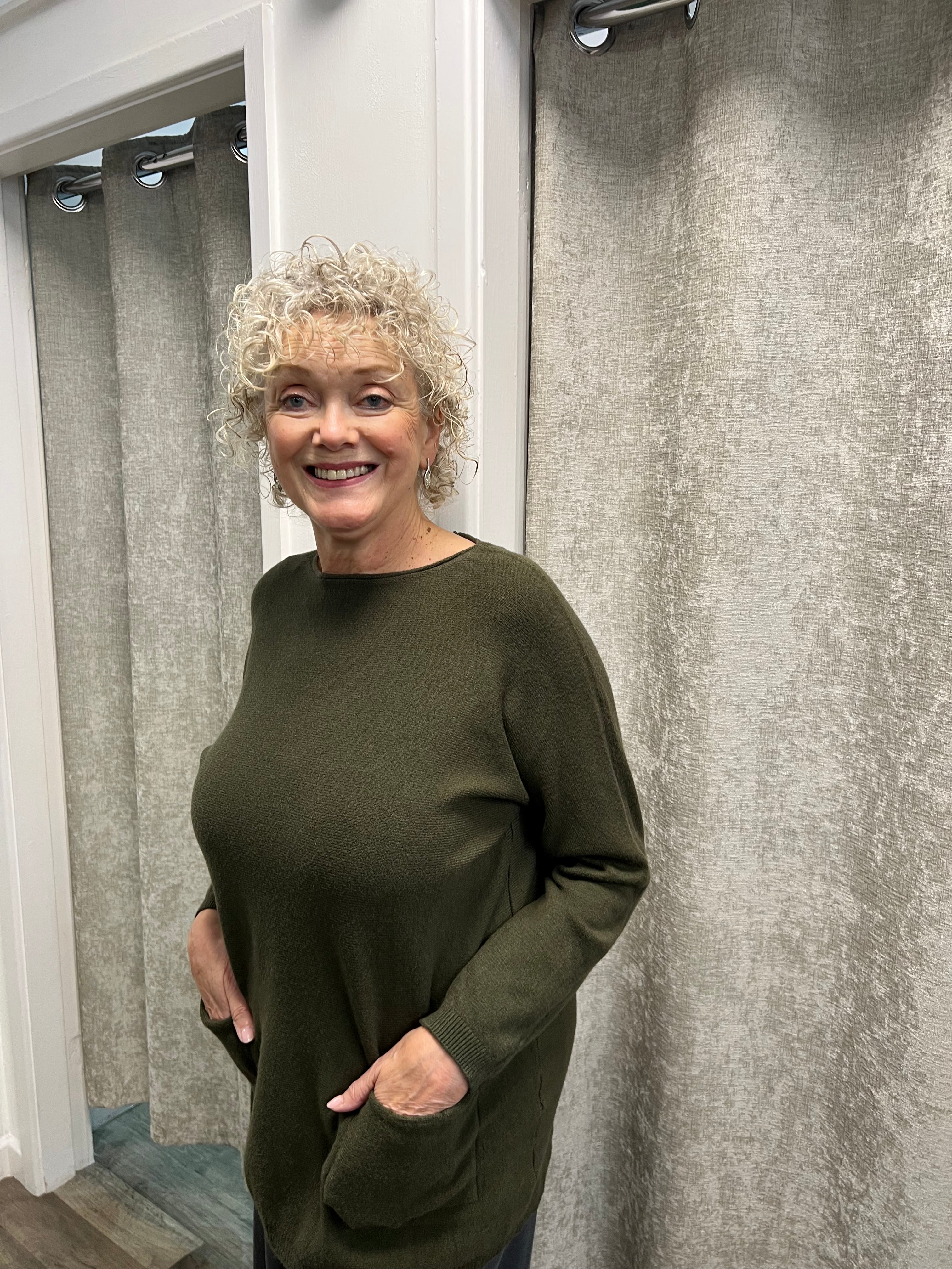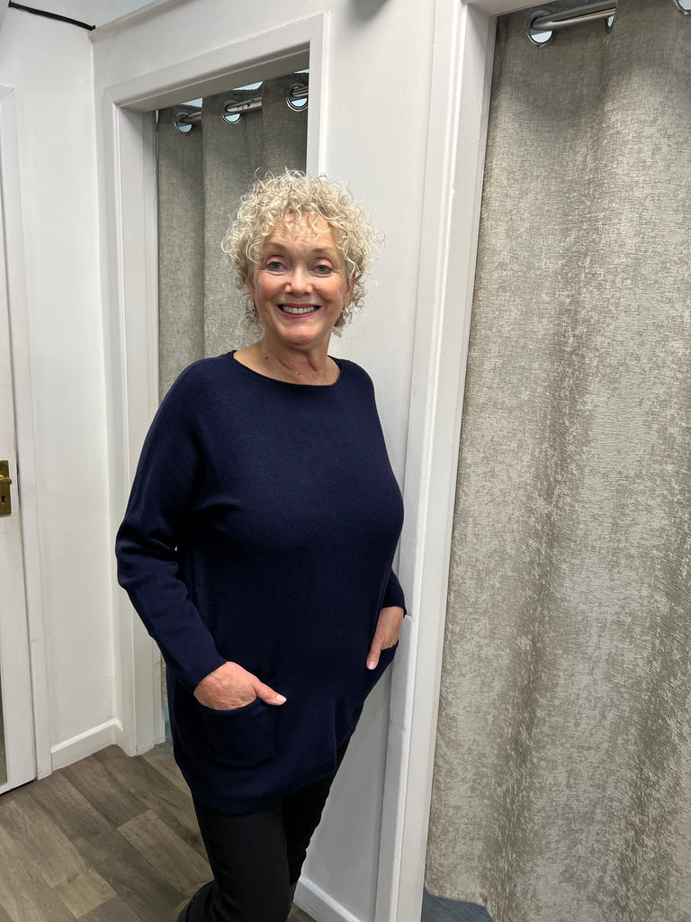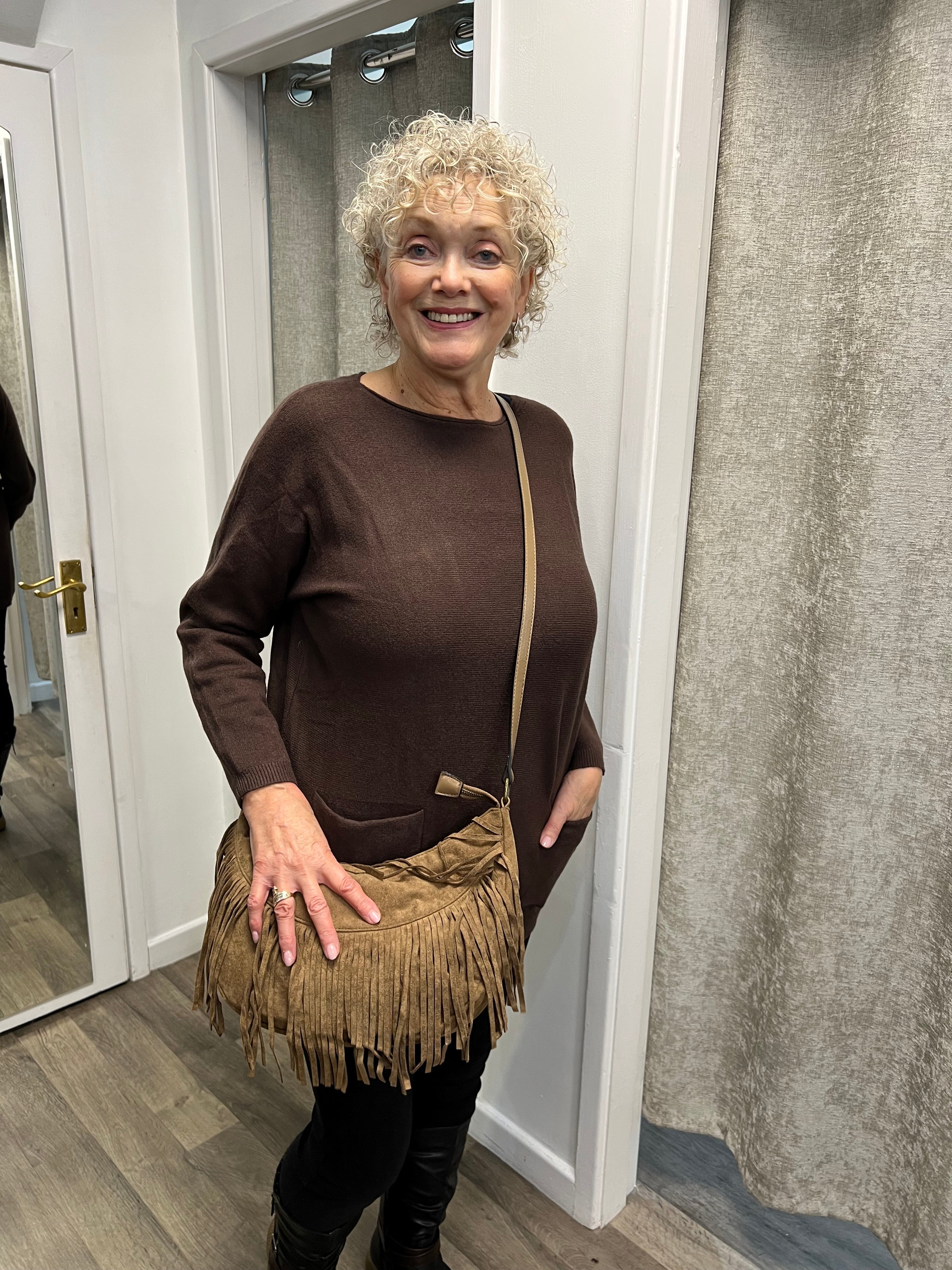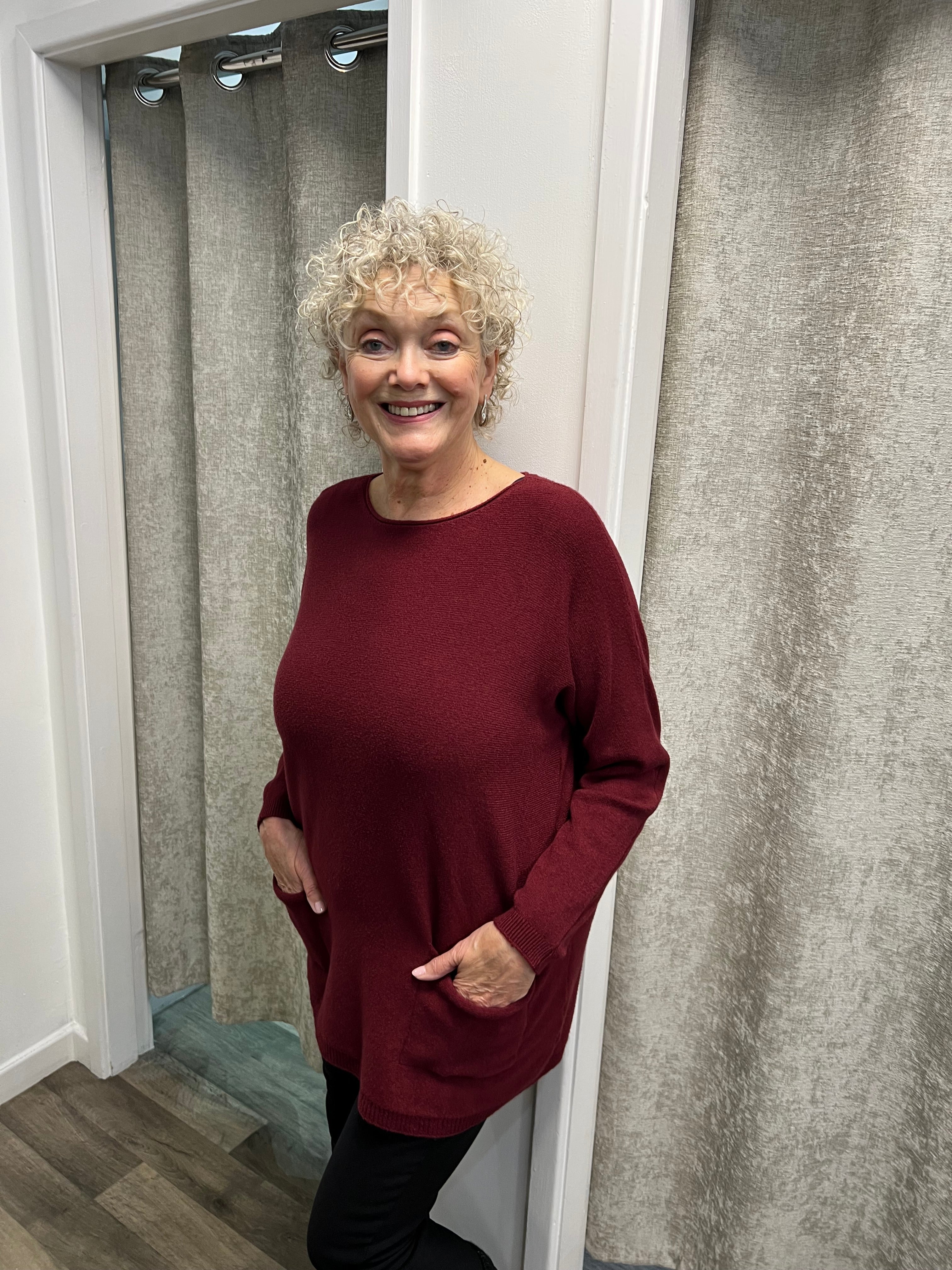 Lovely longer length knit with 2 pockets and bows going down the back.