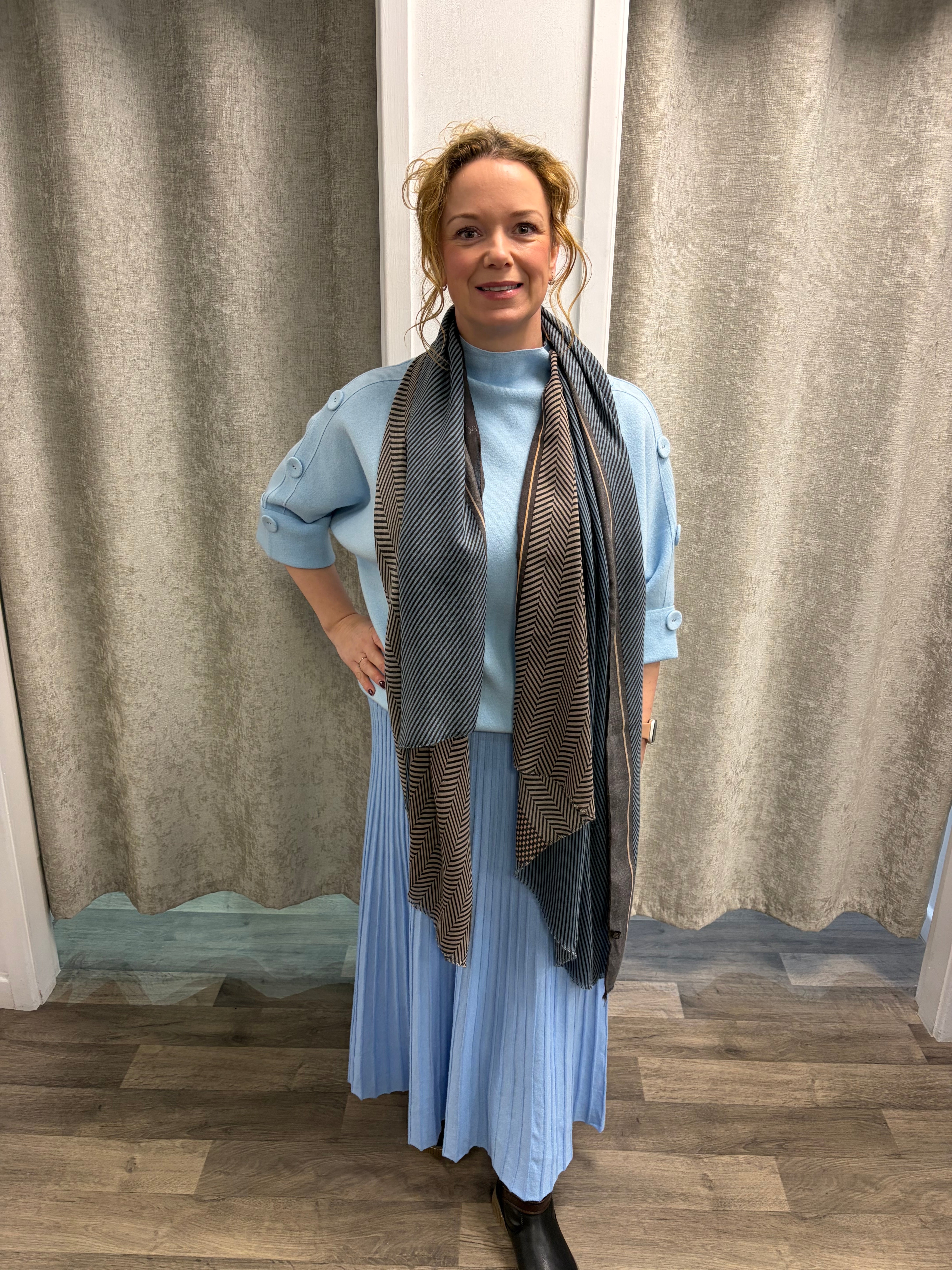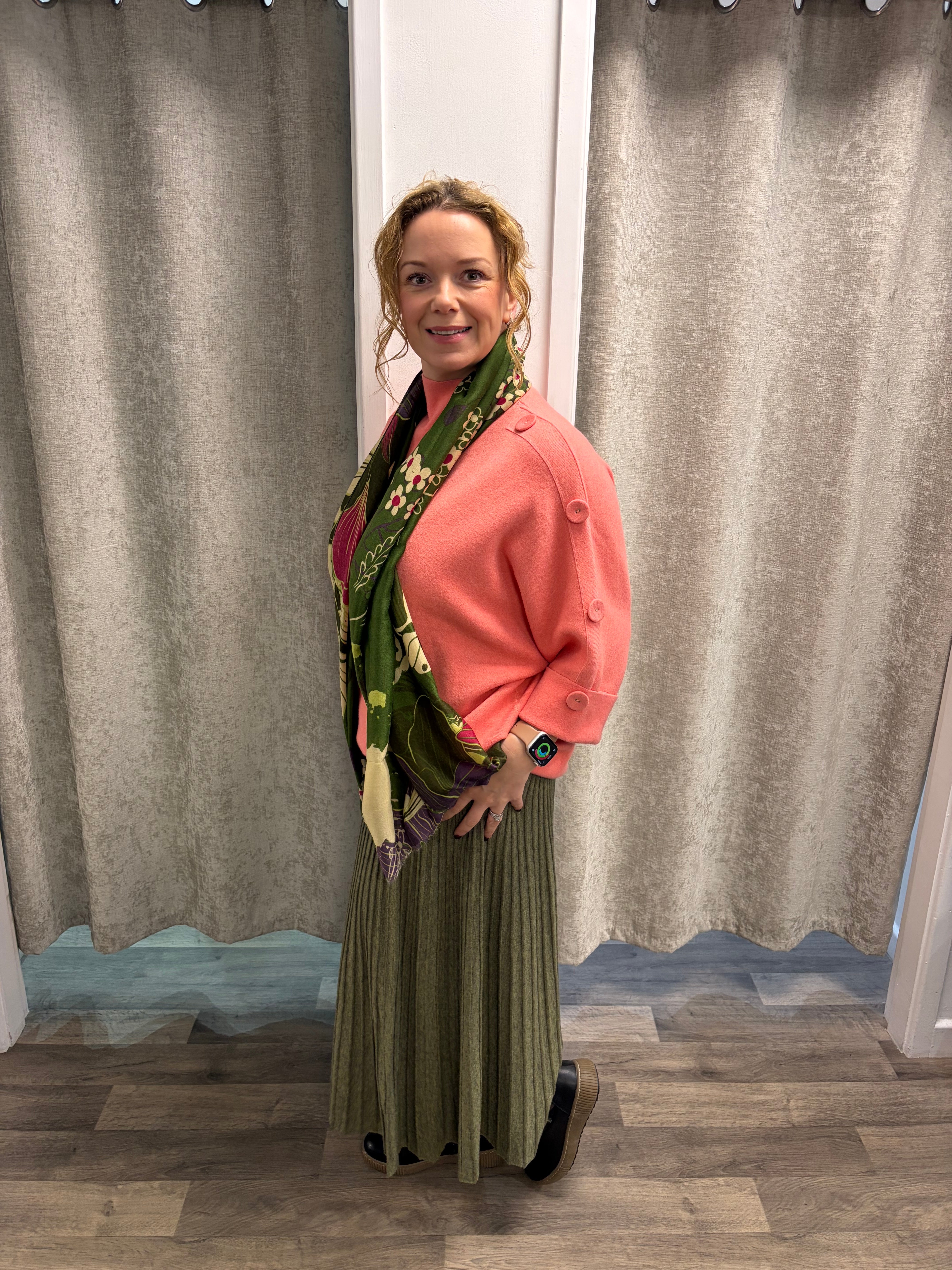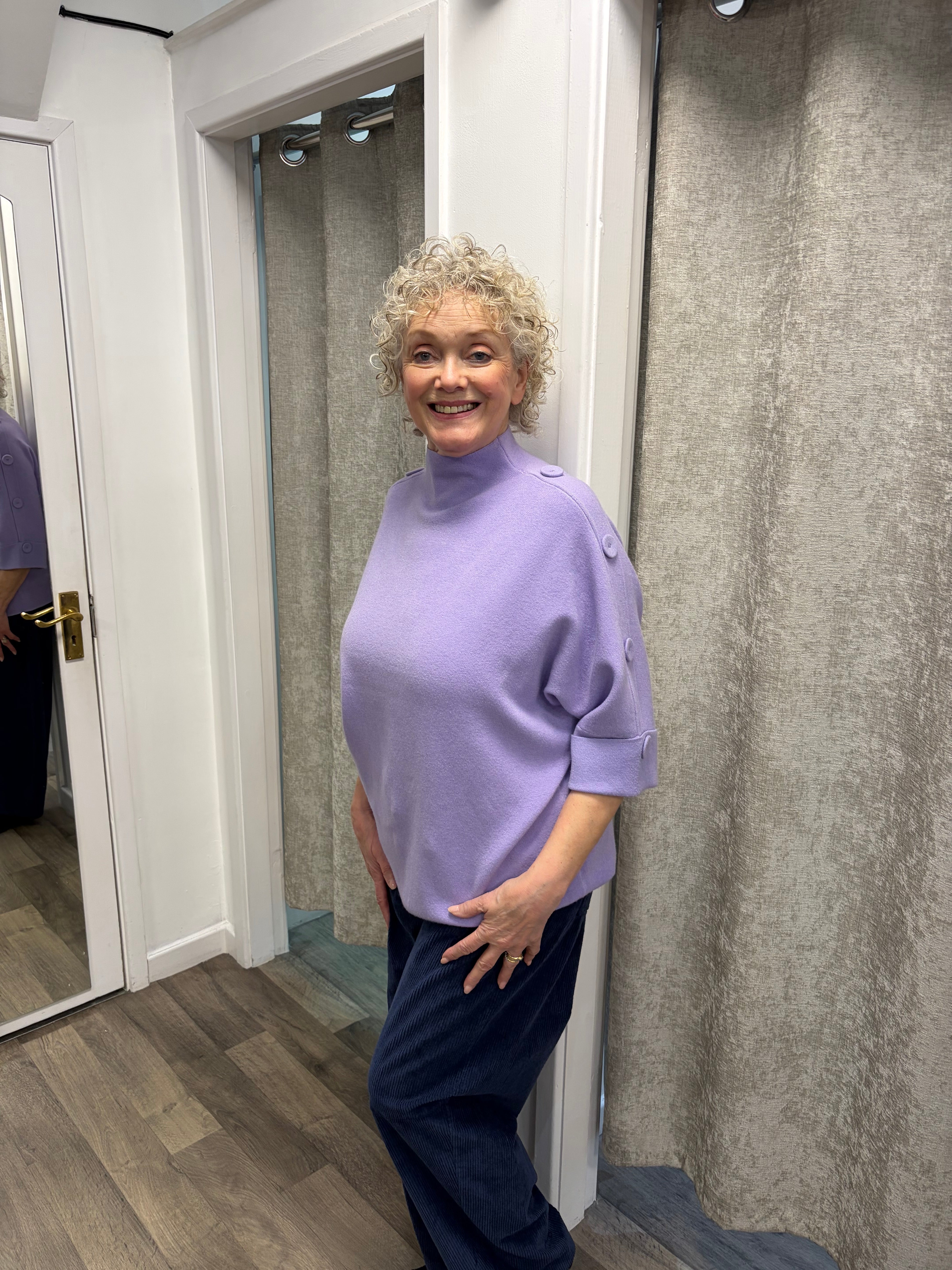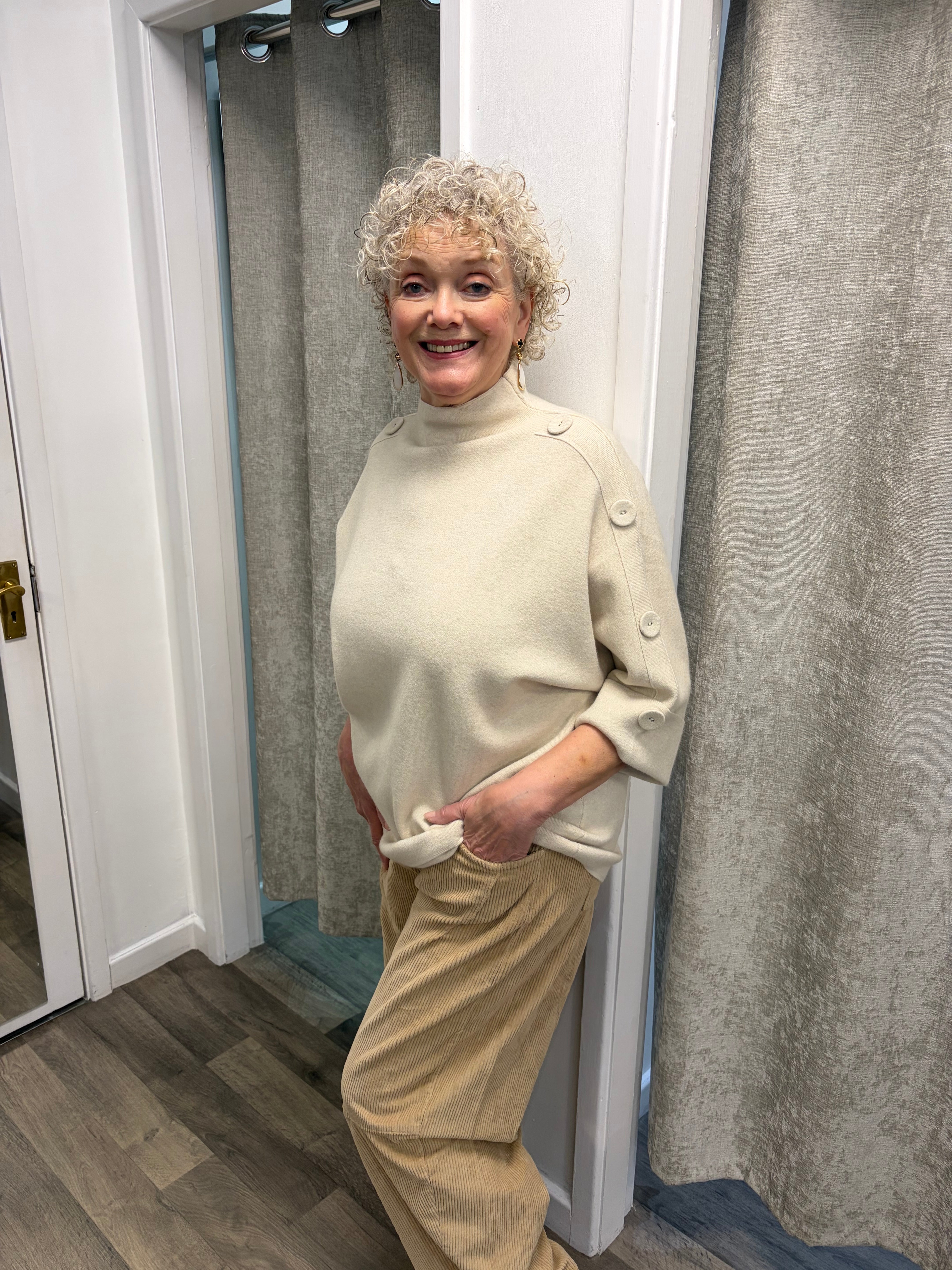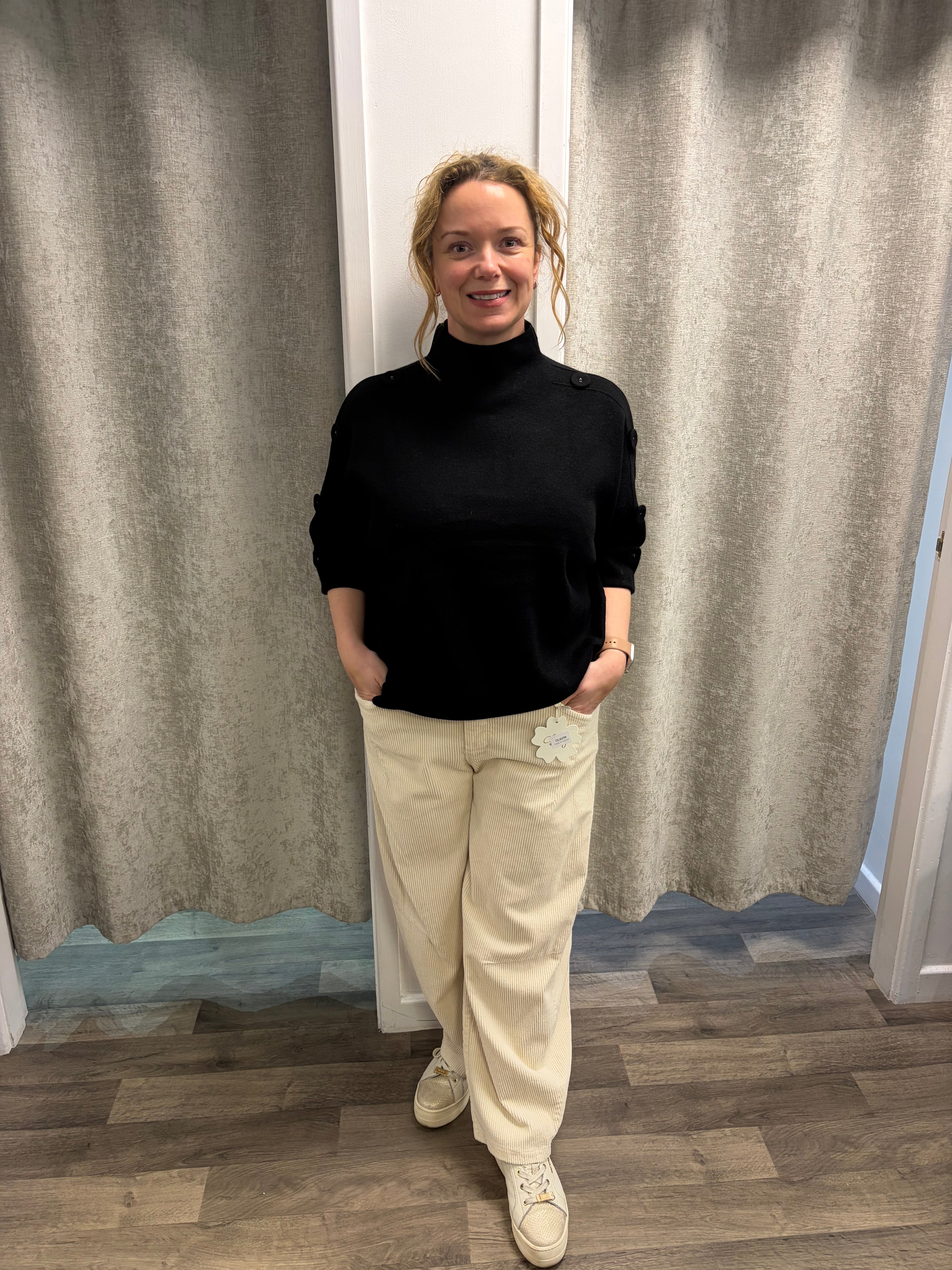 Gorgeous 3/4 sleeved knit with turtle neckline and covered buttons going down each sleeve.