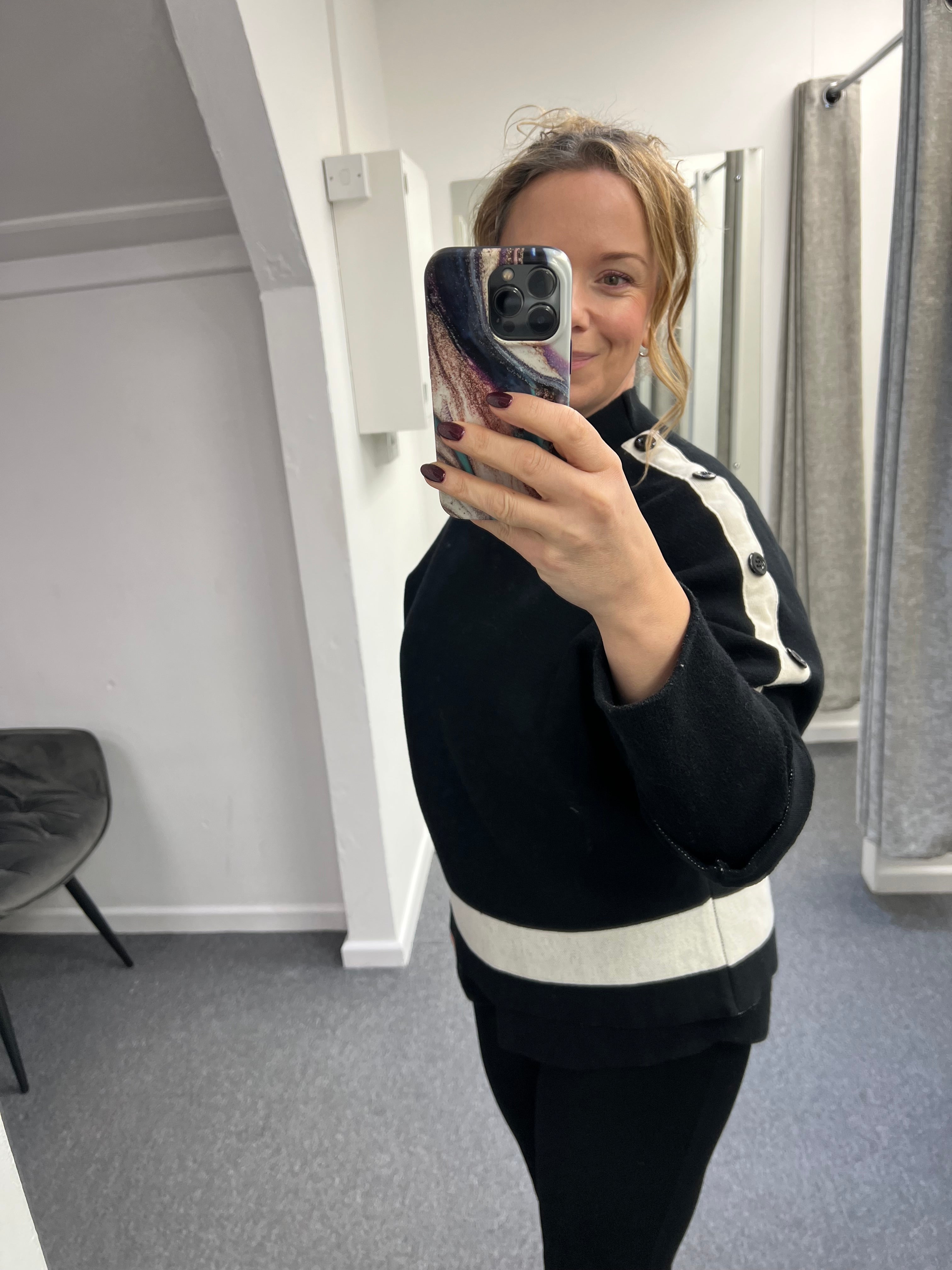 Black and cream knit with button at the sleeves and panel detail.