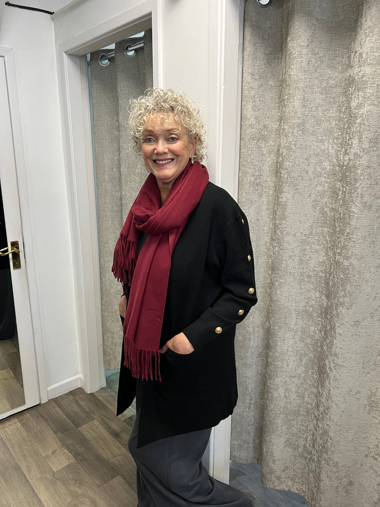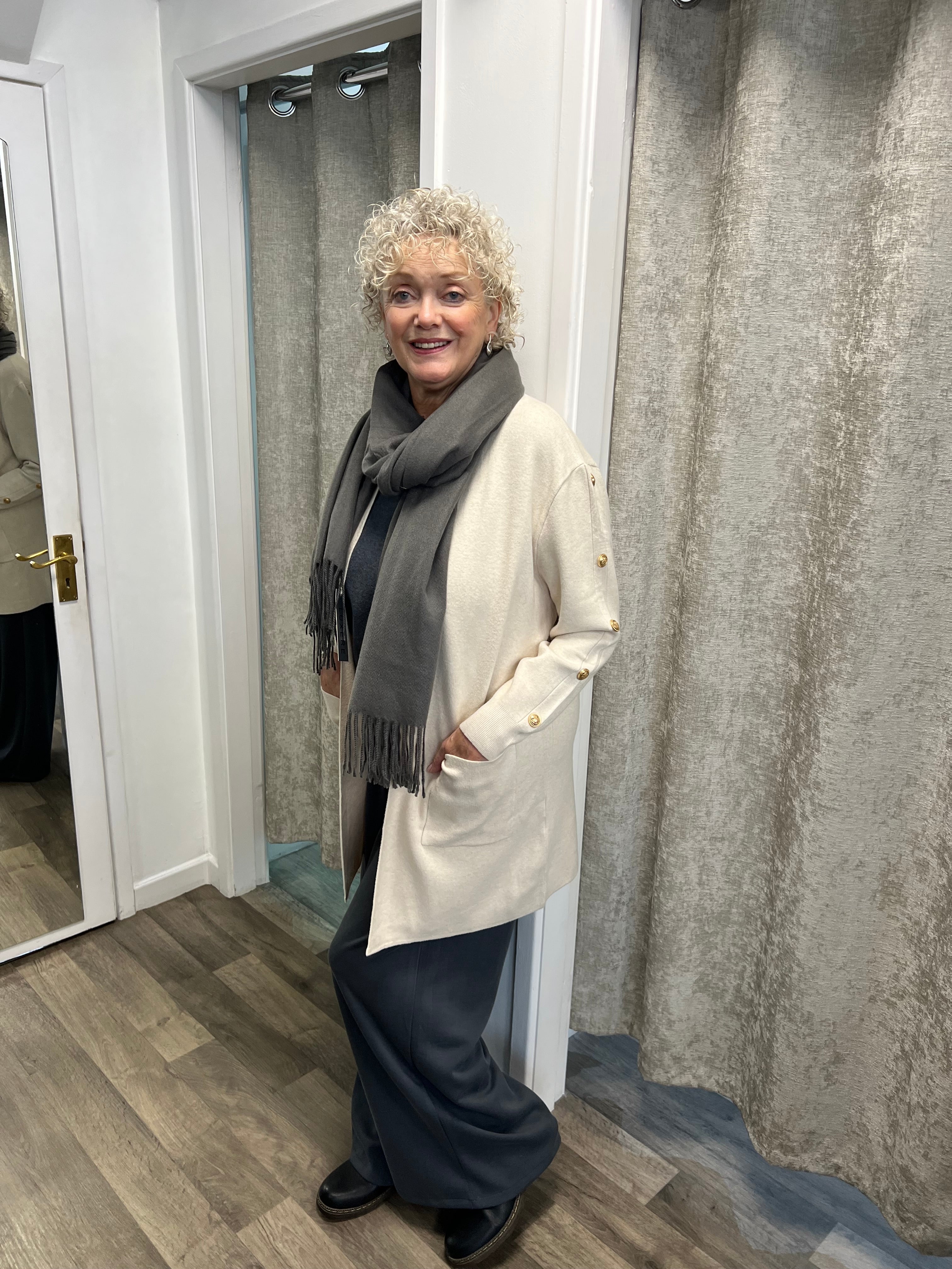 Lovely heavy weight knit cardigan with gold button detail down the sleeves.